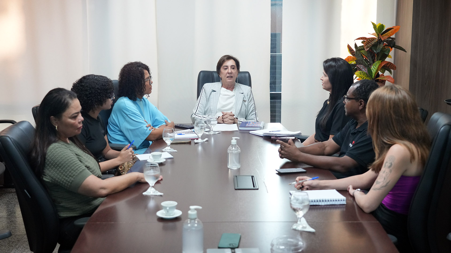 Rondinelli Ribeiro Homens e mulheres sentados em mesa branca em formato U, em sala de paredes brancas e persiana bege