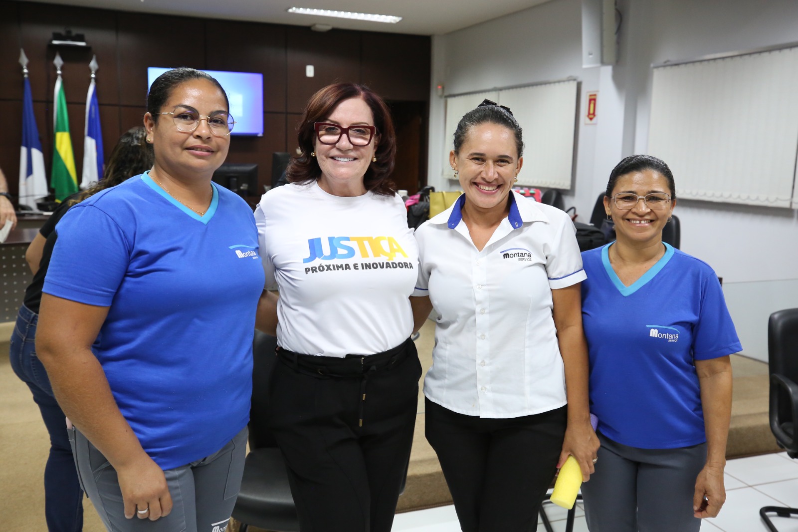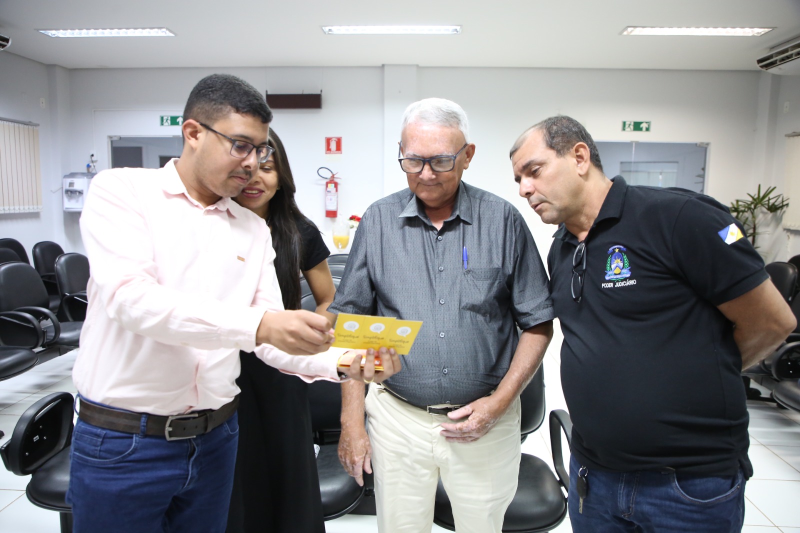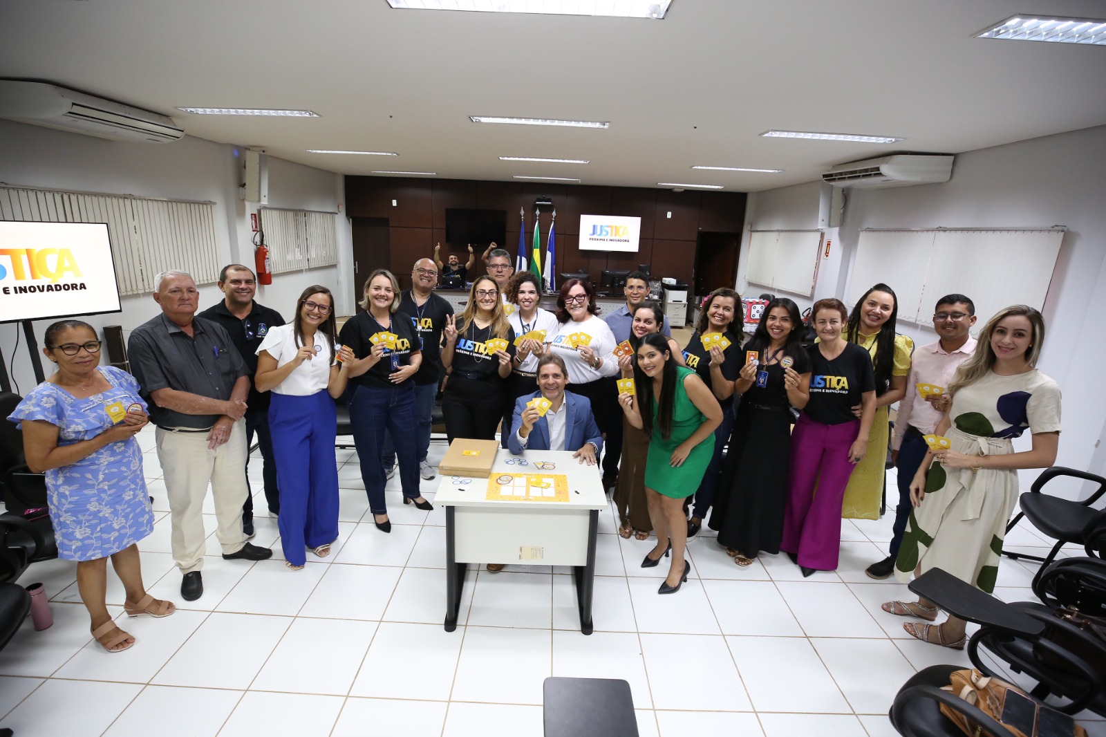 Elias Oliveira foto colorida horizontal mostra homens e mulhres de pé sorrindo no salão do juri do forum de goiatins