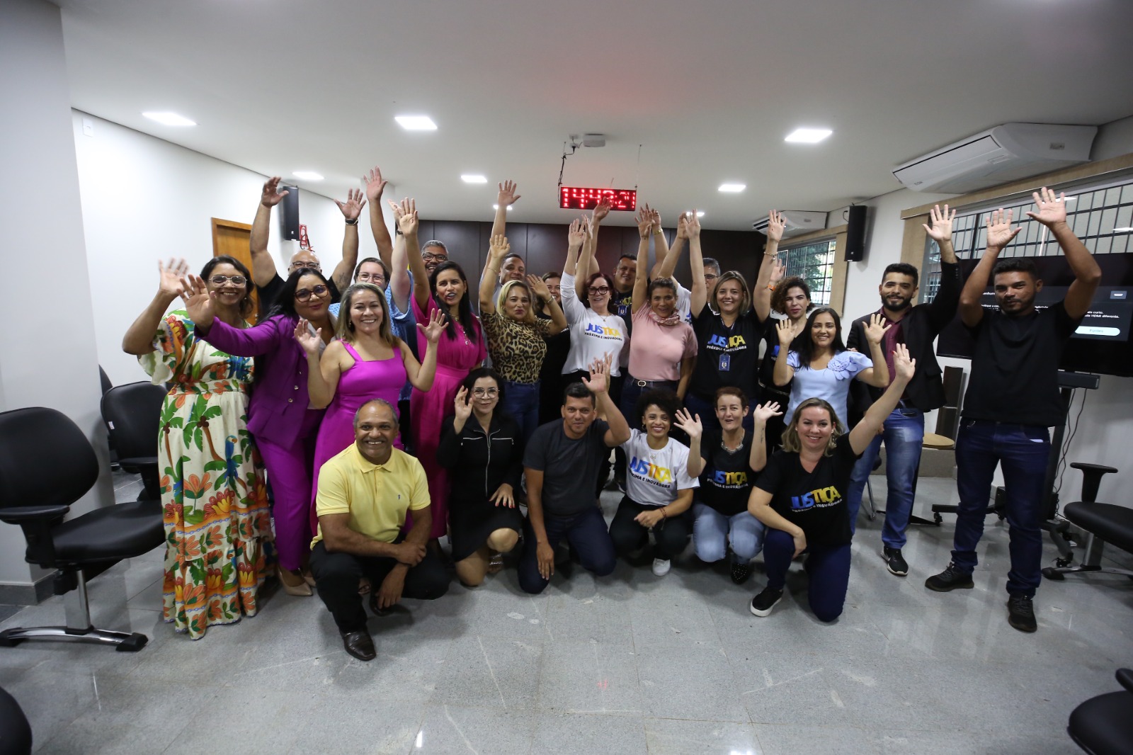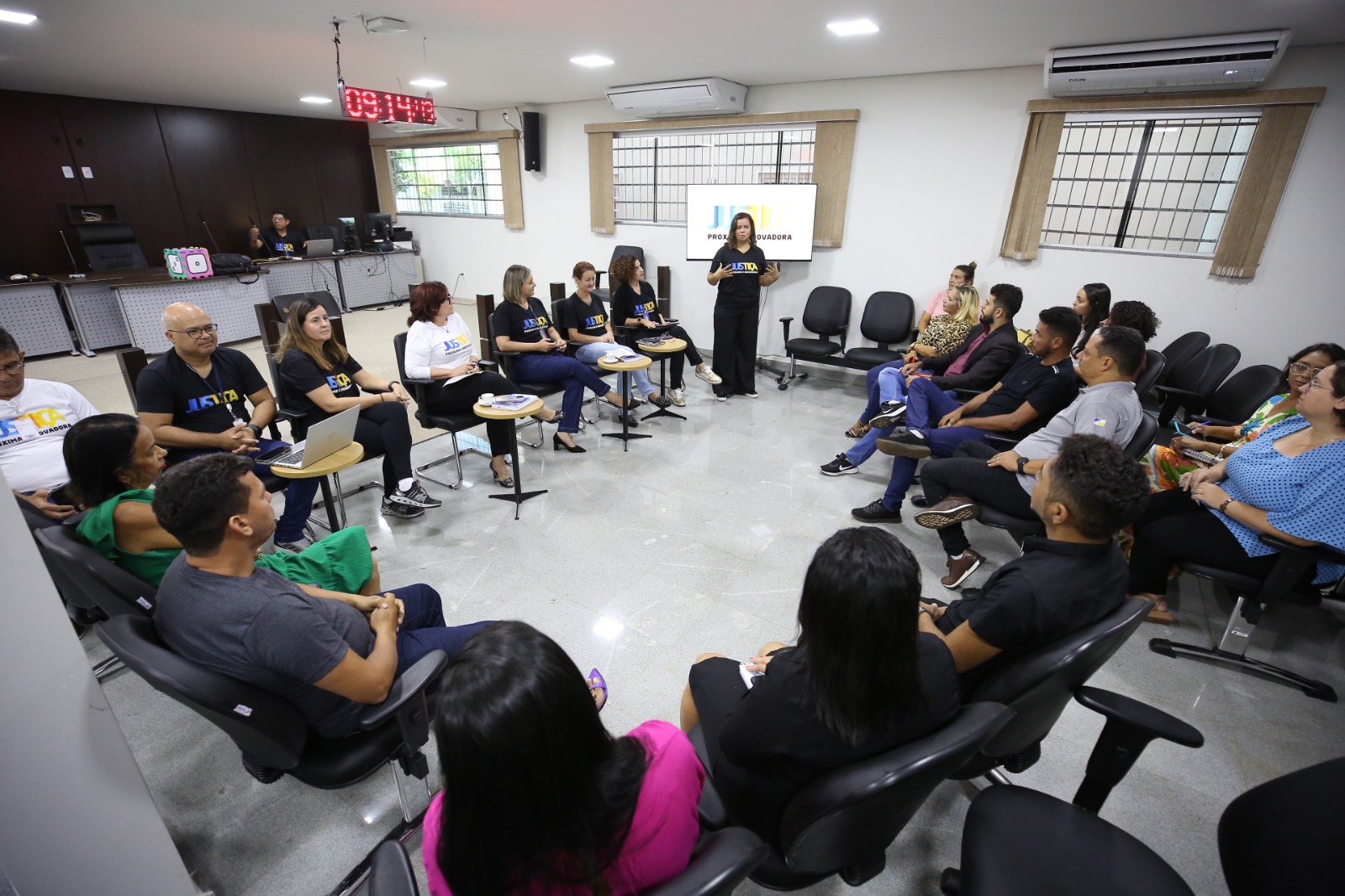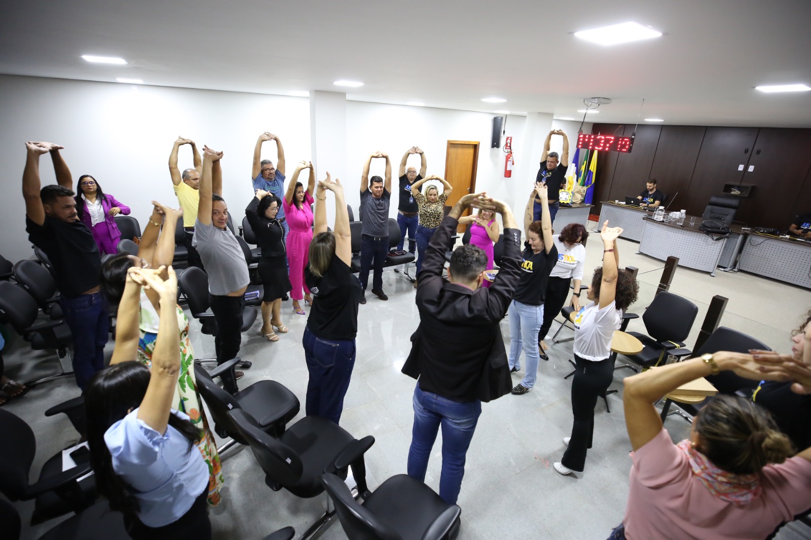 E para finalizar o encontro entre a equipe do projeto Justiça Mais Próxima e Inovadora e os integrantes da Comarca de Pedro Afonso, Hozana Lemos, fisioterapeuta do Centro de Saúde, coordenou uma prática de ginástica laboral.
