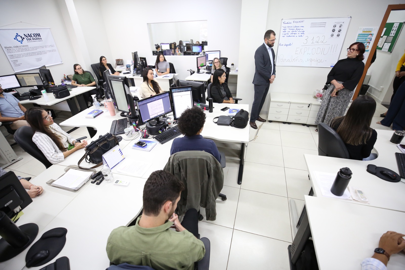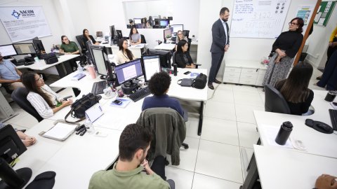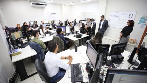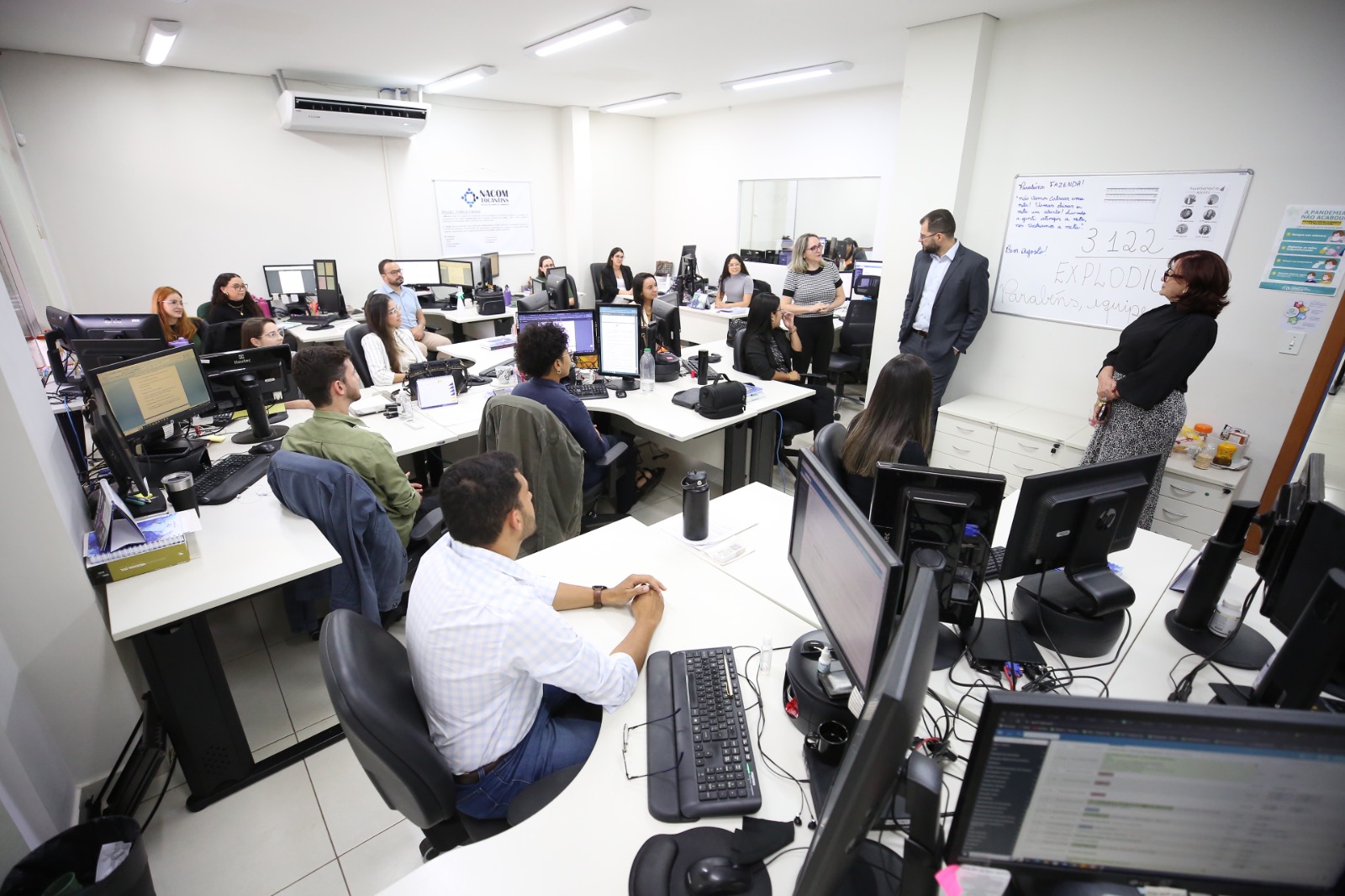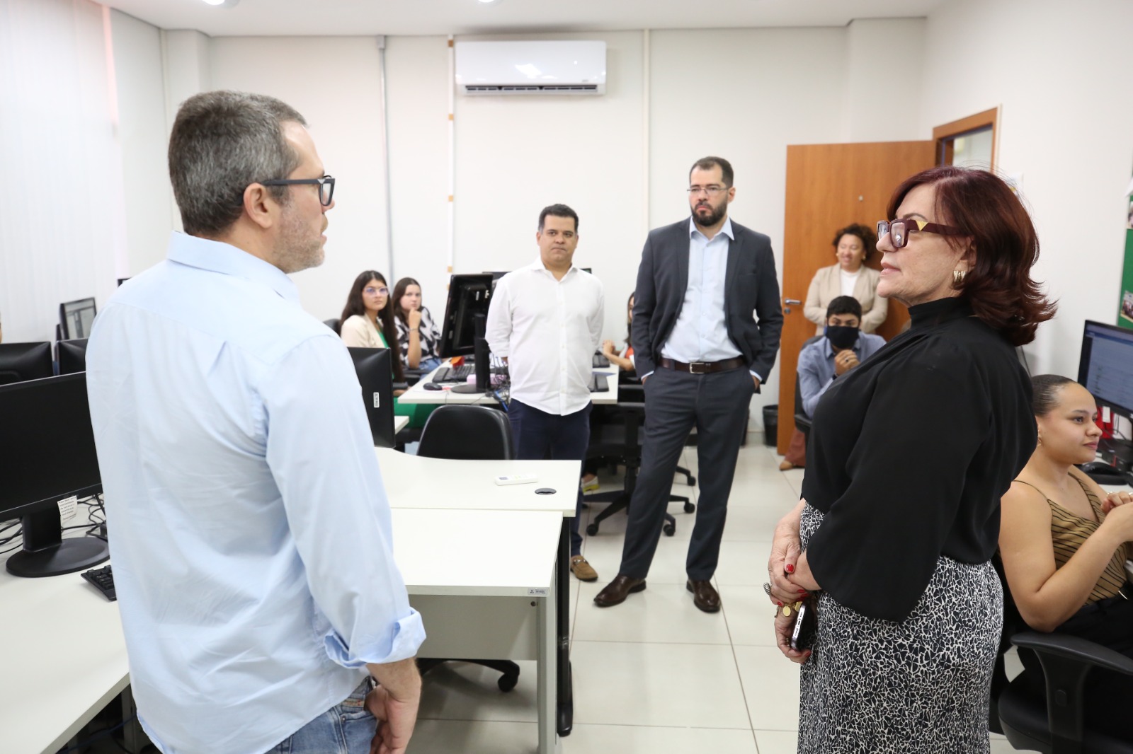 Elias Oliveira Pessoas sentadas atrás de computadores e no centro homens e mulheres em pé durante uma visita institucional