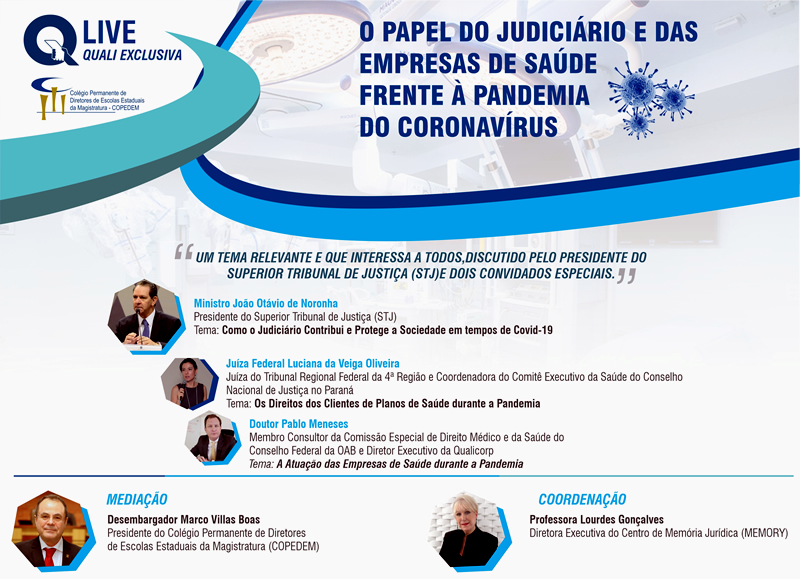 Com a proposta de favorecer o diálogo e a atuação do Judiciário e das empresas de saúde ante a epidemia global do coronavírus, que no Brasil já fez mais de duas mil vítimas fatais em todos os estados da Federação, o Colégio Permanente de Diretores de Escolas Estaduais da Magistratura (Copedem) em parceria com a Qualicorp Administradora de Benefícios realizam, na próxima sexta-feira (24), uma live nas plataformas digitais sobre O Papel do Judiciário e das Empresas de Saúde frente à Pandemia do Coronavírus. O evento digital está previsto para ocorrer a partir das 16 horas, horário de Brasília-DF.
