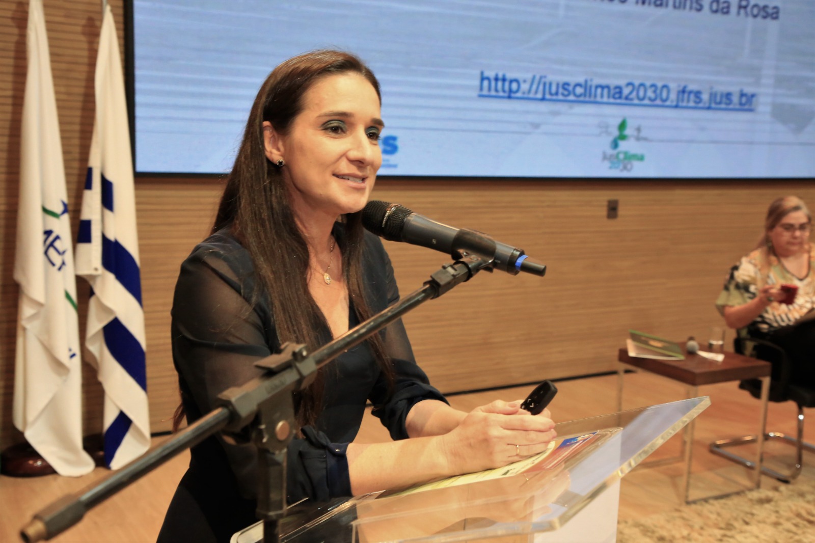 Durante palestra, a juíza expôs a temática para os participantes do evento em duas partes. Na primeira, fez deferência à ciência sobre mudanças climáticas, trazendo entendimento, principalmente sobre o conceito de emergência climática. E, na segunda parte, falou sobre a atuação do Poder Judiciário referente à litigância climática e questões de gestão.