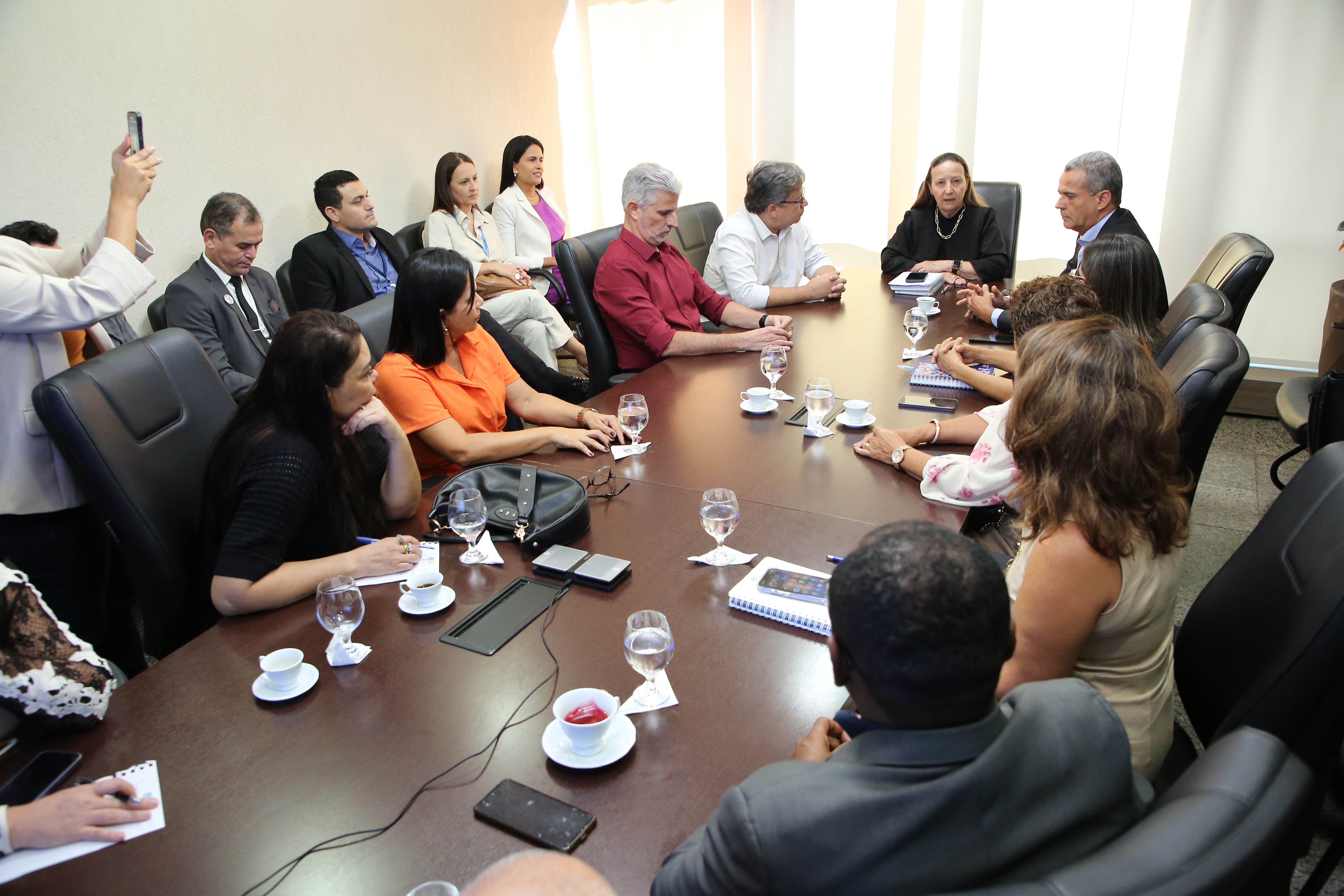 Elias Oliveira Fotografia aberta de uma reunião de grupo em torno de uma mesa grande, com várias pessoas sentadas em cadeiras, em uma sala.