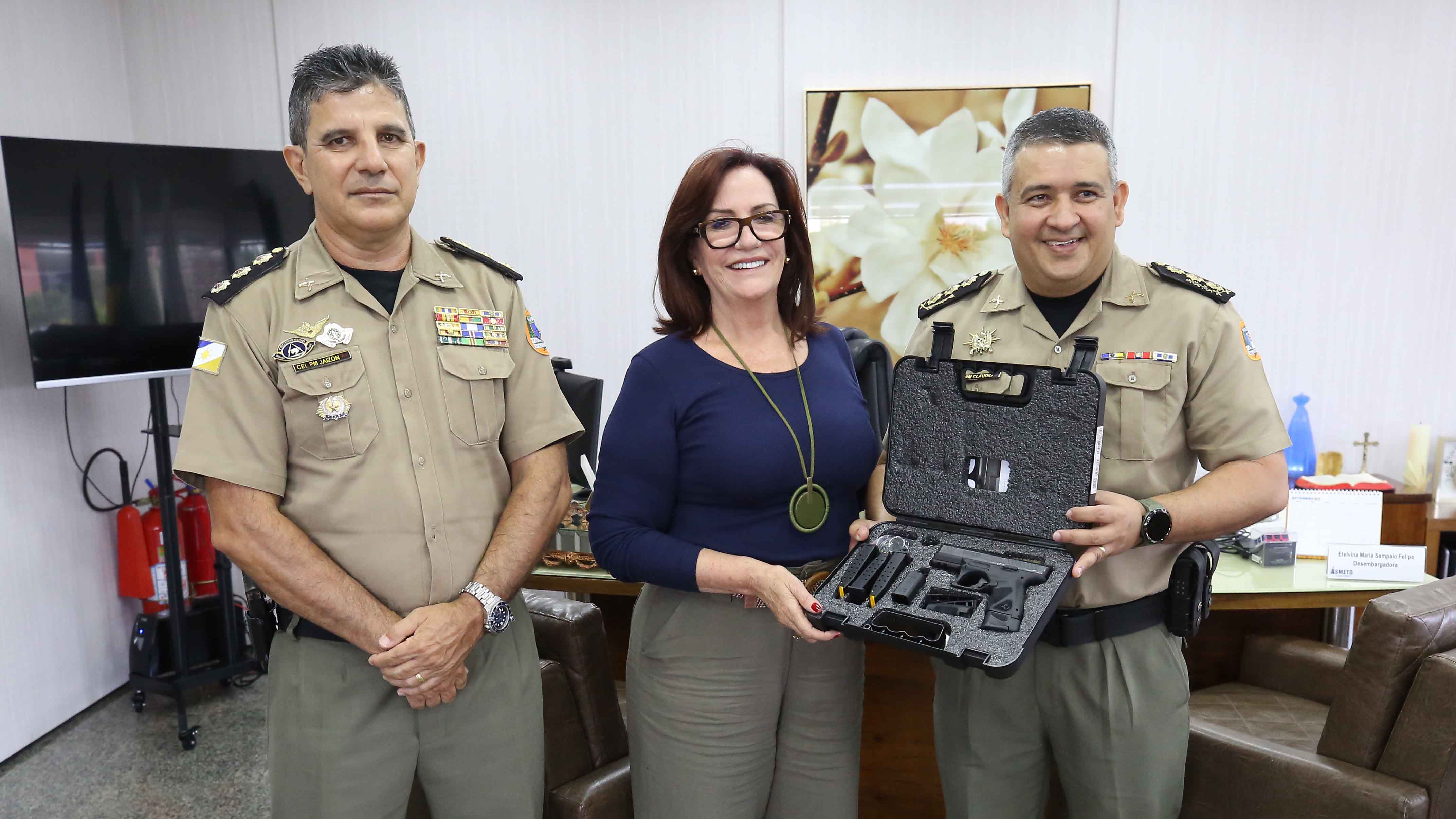 Os (as) Policiais Militares (PM) disponibilizados ao Poder Judiciário do Tocantins, a partir de agora, vão trabalhar com armamento da própria instituição. As 50 pistolas (TS9C - Taurus) adquiridas pelo Judiciário tocantinense foram entregues, nesta quarta-feira (6/9) à presidente do Tribunal de Justiça do Tocantins (TJTO), desembargadora Etelvina Maria Sampaio Felipe, por representantes da PM do Tocantins.