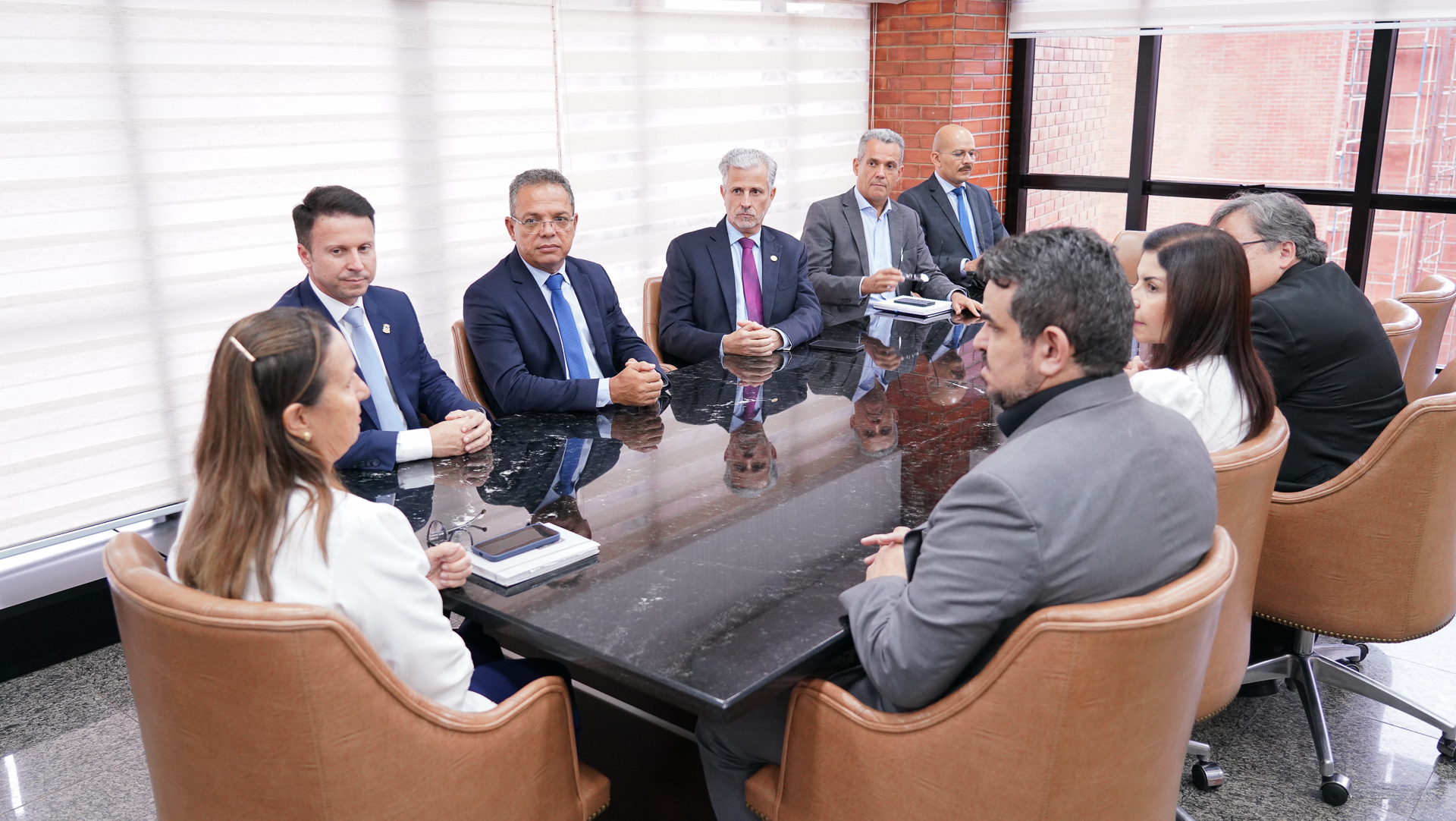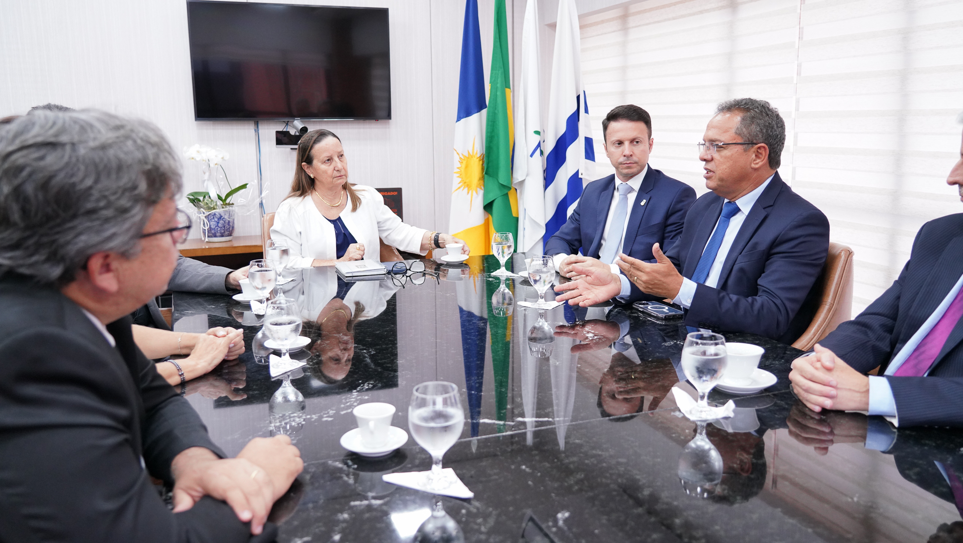 Lucas Nascimento Foto aberta de reunião, com a presidente do TJTO no centro da mesa, ela está de frente e usa casaco branco e blusa azul marinho; à sua direita e esquerda quatro secretários de Estado, sendo três homens e uma mulher; todos estão sentados e conversando