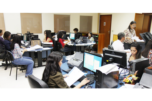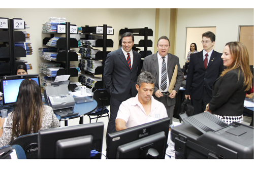 A presidente do Tribunal de Justiça do Tocantins, desembargadora Ângela prudente, visitou nesta quinta-feira, (25/7), a Central de Execuções Fiscais da Comarca de Palmas. Acompanhada do coordenador da Central de Palmas juiz Sândalo Bueno, da coordenadora da Central de Araguaína, juíza Milene de Carvalho, do coordenador da Central de Gurupi juiz Nassib Cleto Mamud, do diretor em substituição do Fórum de Palmas, juiz Lauro Augusto Moreira Mais e dos juízes, Rodrigo da Silva Perez, Valdemir Braga, Odete Batista Dias de Almeida, Frederico Paiva de Souza, do Presidente da Associação dos Magistrados do Tocantins, (Asmeto), juiz Helvécio de Brito Maia Neto, do Diretor Geral do TJTO, Flávio Leali e do coordenador Jurídico da Prefeitura de Palmas, Públio Borges, a Presidente conferiu o trabalho dos 32 servidores que atualmente estão concentrados na digitalização de cerca de 16 mil processos físicos.
