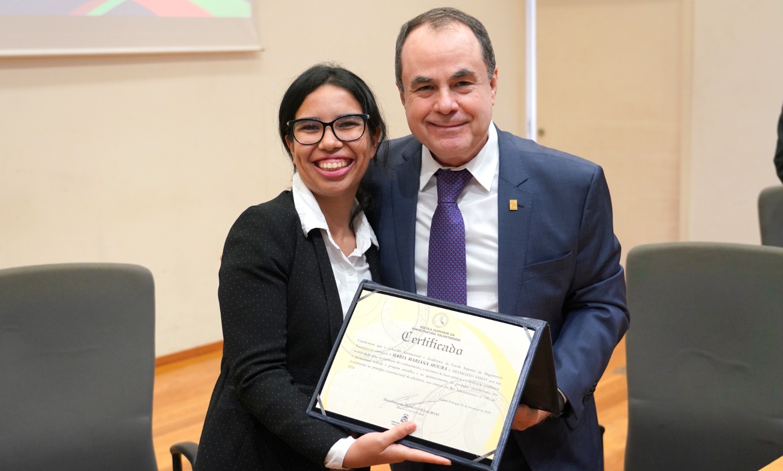 Também na ocasião, o desembargador Marco Villas Boas, diretor geral da Esmat, entregou ao professor doutor Eduardo Vera-Cruz Pinto, diretor da Faculdade de Direito da Universidade de Lisboa, a Medalha “Desembargador Antonio Rulli Junior”, comemorativa aos 15 anos da Escola Superior da Magistratura Tocantinense (Esmat), como também o Medalhão Esmat para a doutoranda em Direito, Maria Mariana Moura, coordenadora local desta edição do Congresso.