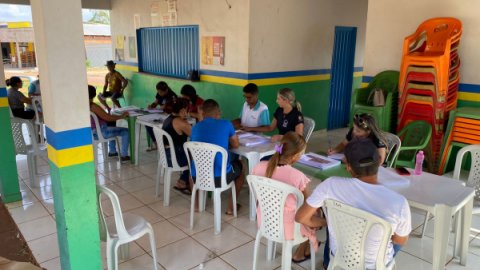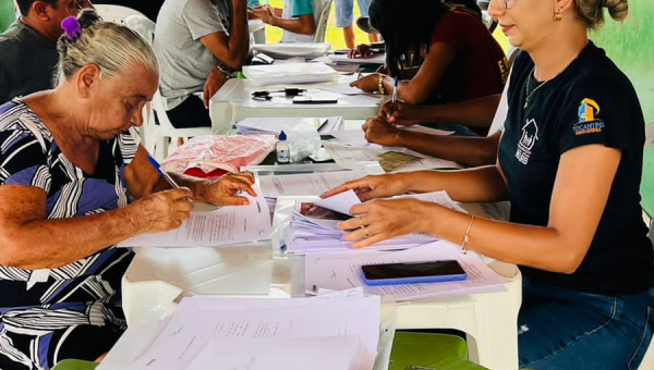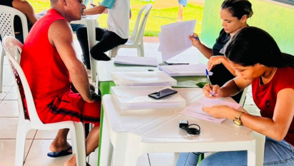 Lucas Nascimento (Corregedoria-Geral da Justiça) fotografia colorida que mostra pessoas sentadas em volta de mesas fazendo seu cadastro social no processo de regularização fundiária