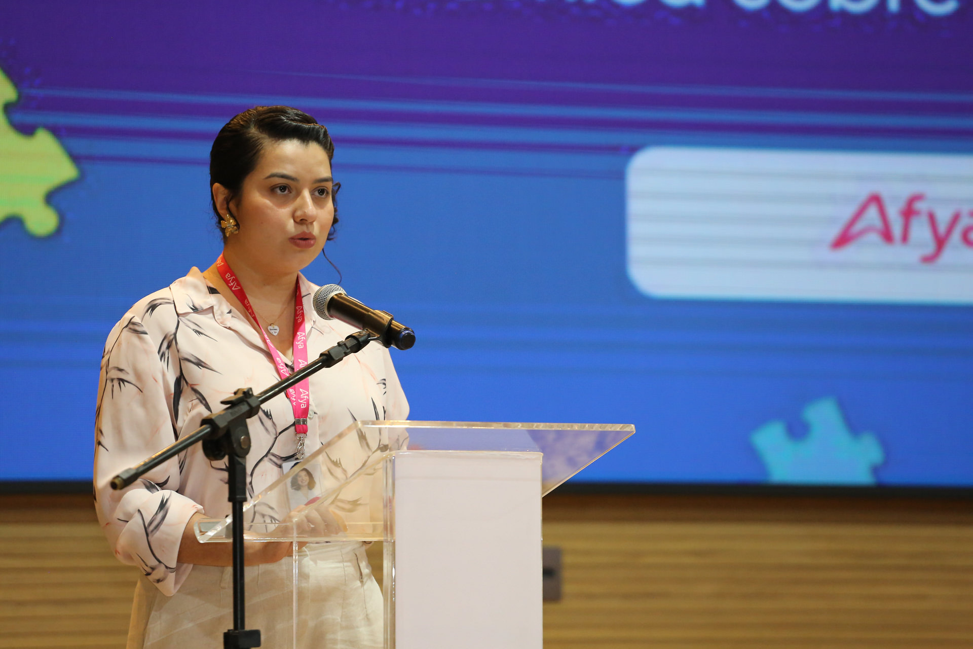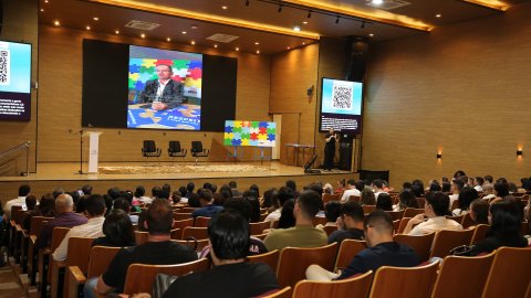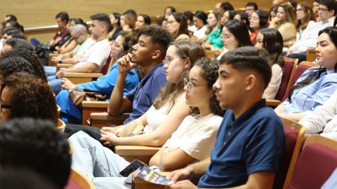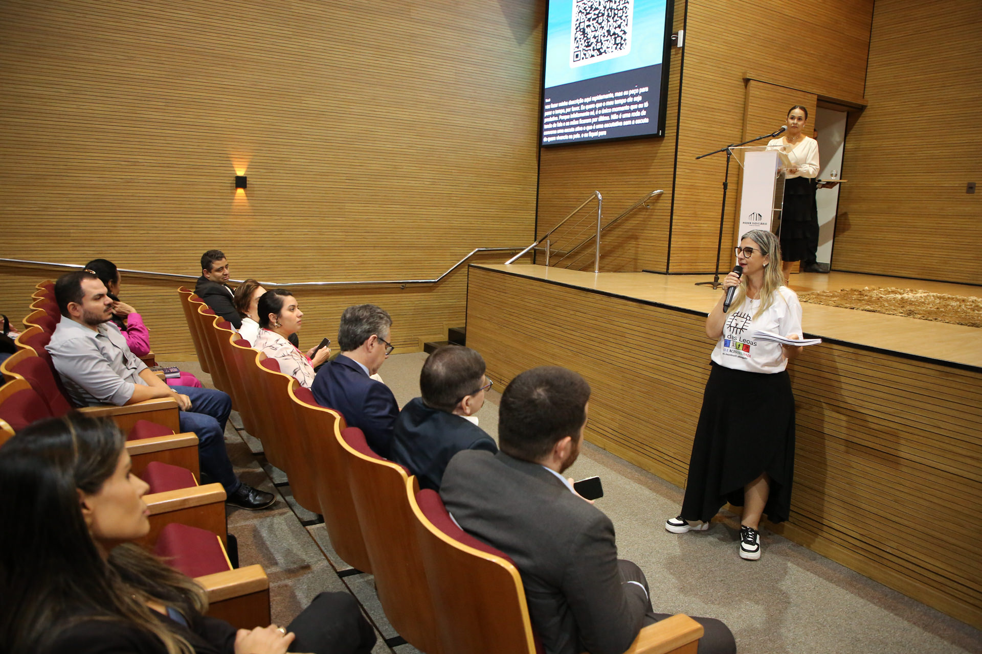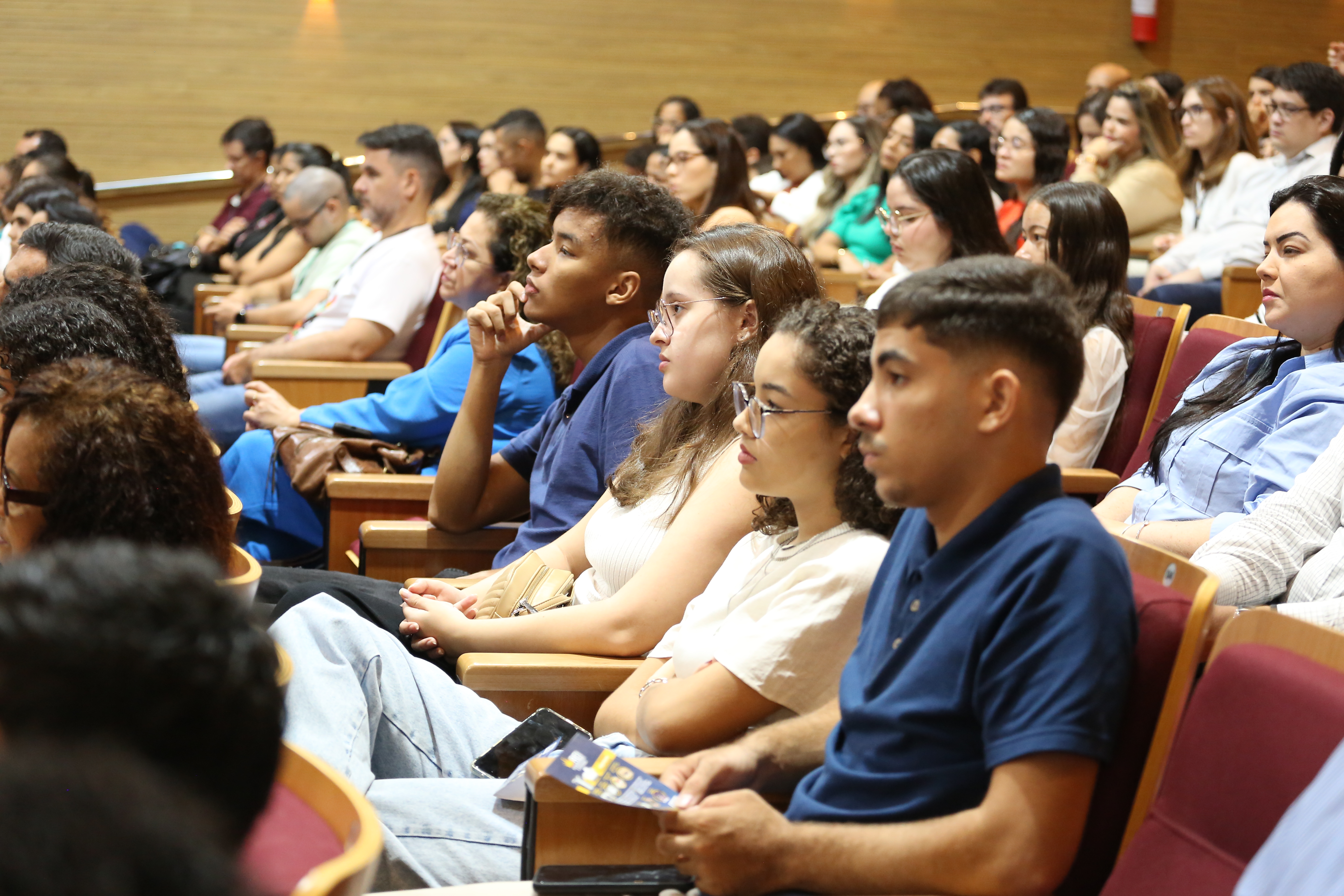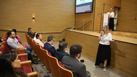 Elias Oliveira Foto de auditório com pessoas sentadas de costas em cadeiras de madeira. Paredes revestidas em madeira. Ao fundo, um telão central e dois menores nos cantos direito e esquerdo projetam imagem sobre palestra do dia, autismo