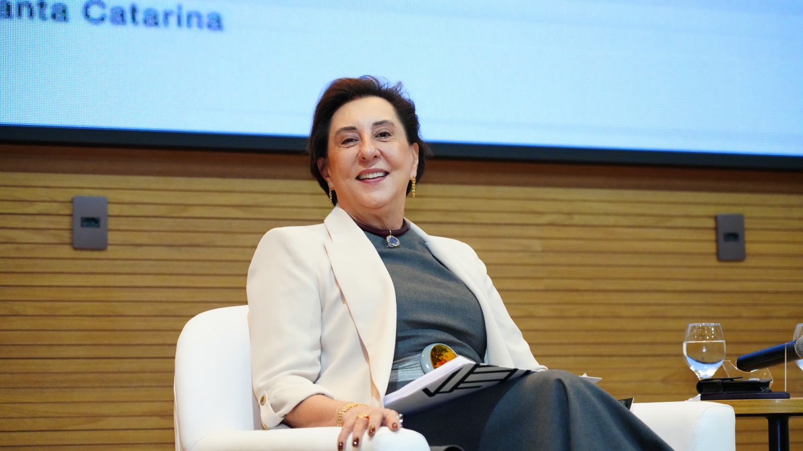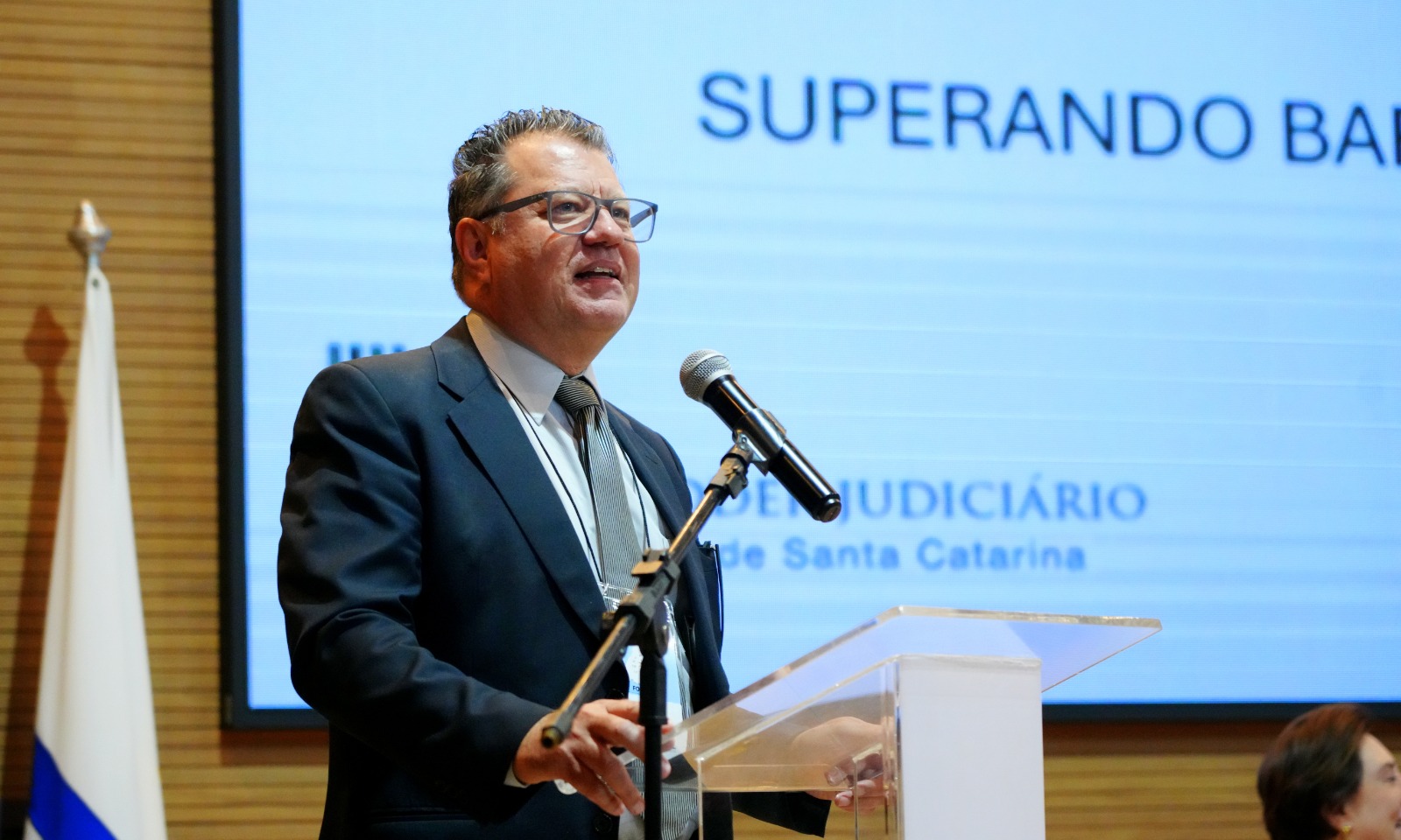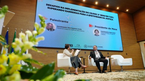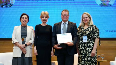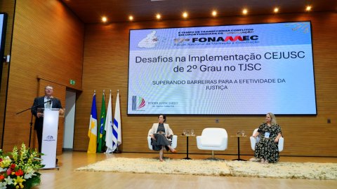Durante sua fala, o desembargador convidou Chrystiane Maria Uhlmann, gestora de Conciliação e Mediação da Cojepemec do TJSC, a juntar-se a ele no palco. O magistrado ressaltou a relevância da atuação da servidora no fortalecimento das práticas de mediação no âmbito da Justiça catarinense.