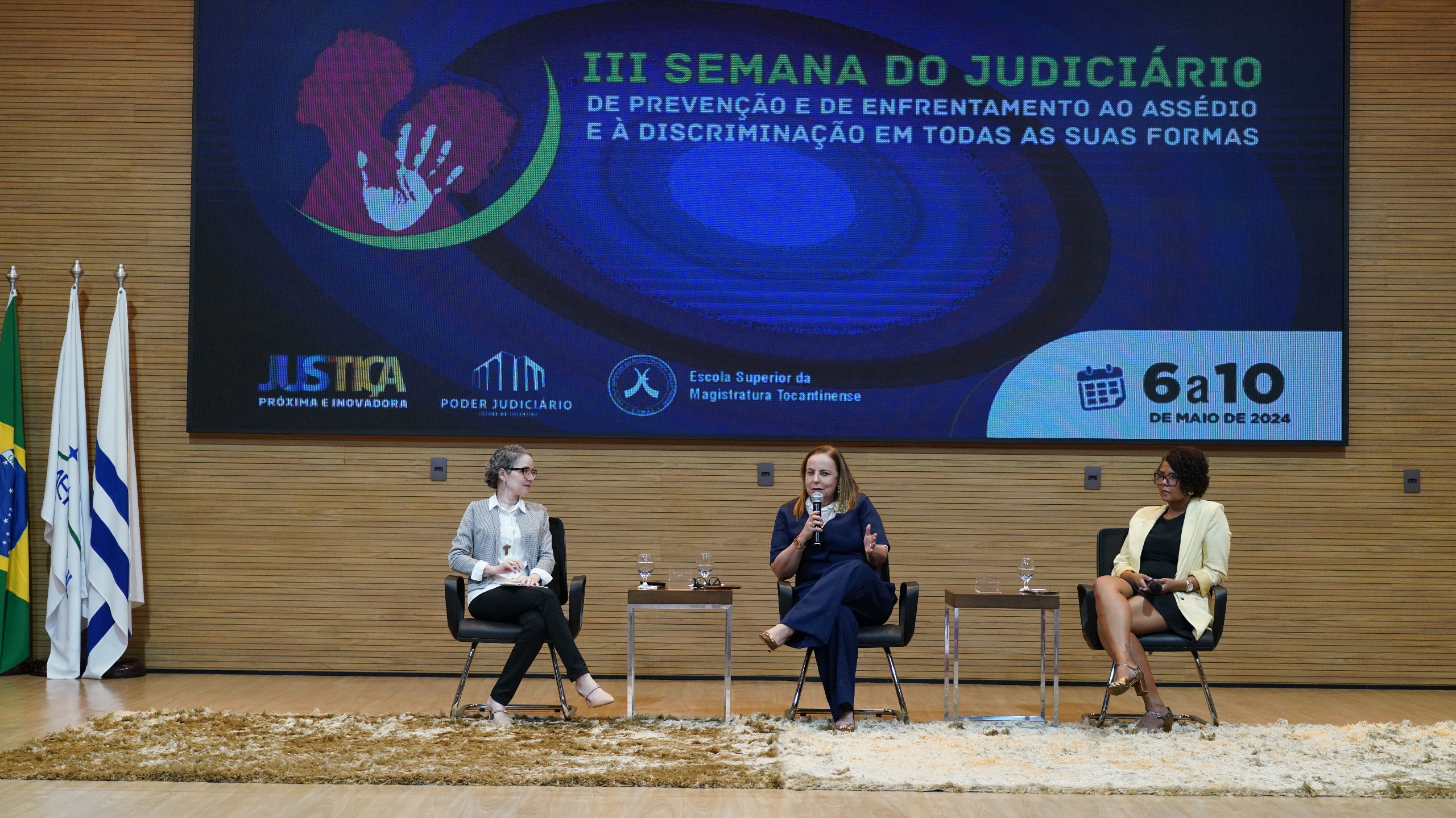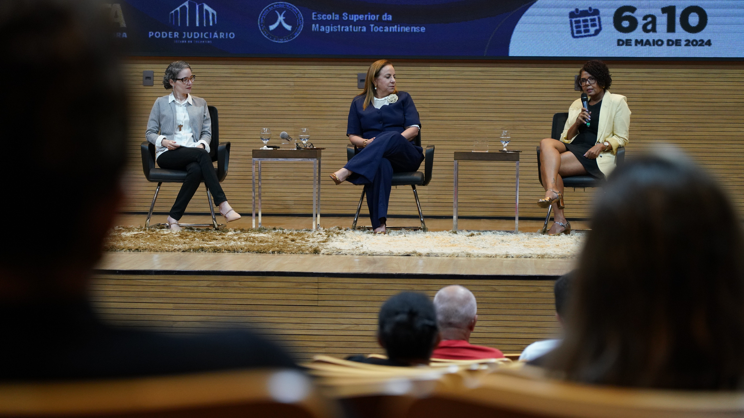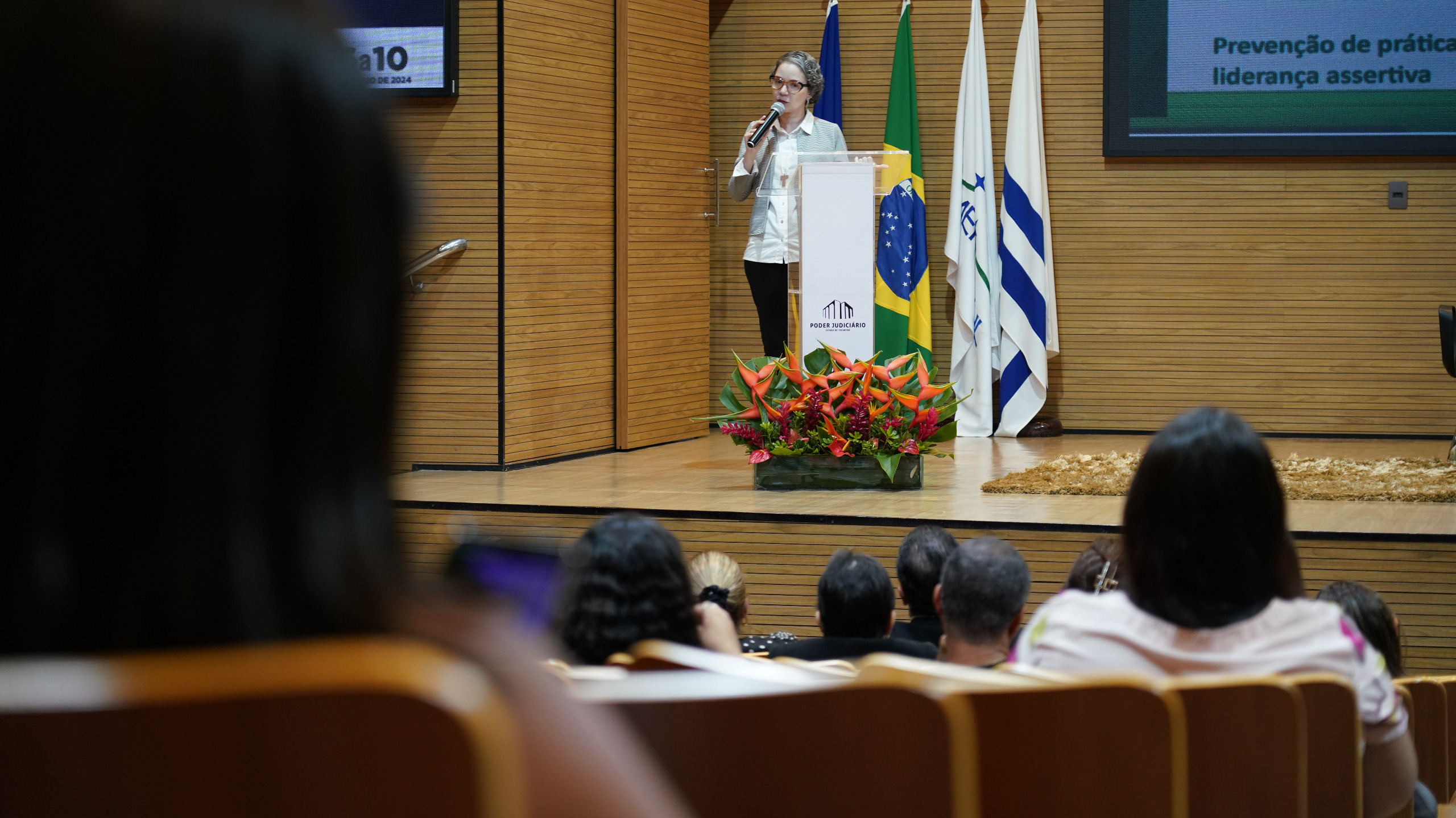 Rondinelli Ribeiro (TJTO) Auditório do Tribunal de Justiça do Tocantins, com várias cadeiras de madeira e algumas pessoas assistindo a palestra de costas para a foto, no final da foto tem um telão com o slide da apresentação da palestra, tem três cadeiras pretas, mas apenas duas mulheres estão sentadas, uma estar com vestido preto e blazer amarelo claro e a outra estar sentada ao lado com macacão azul escuro, e em pé falando no púlpito estar uma outra mulher  com blazer cinza.
