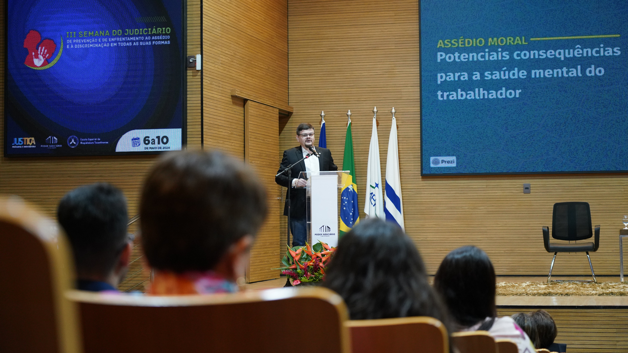 As atividades do segundo dia da III Semana do Judiciário de Prevenção e Enfrentamento ao Assédio e à Discriminação em todas as suas formas foram realizadas na tarde desta terça-feira (7/5), no auditório do Tribunal de Justiça do Estado do Tocantins (TJTO). O Painel 1, com o tema “Assédio e discriminação no ambiente de trabalho: impactos sobre a saúde mental da vítima e os desafios da liderança”, abordou o incentivo à cultura de feedback, o treinamento de equipe (técnicos e desenvolvimento psicossocial) e o desenvolvimento de políticas de saúde e segurança voltadas para o trabalhador.
