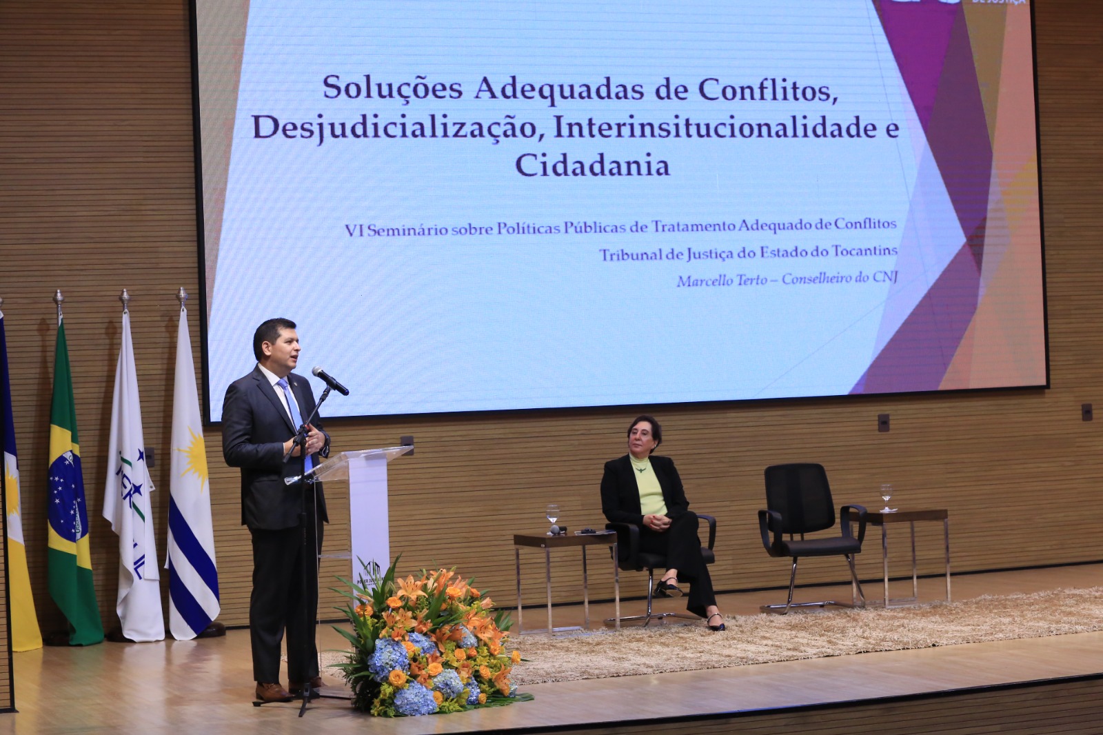 Coordenado pela desembargadora Angela Issa Haonat, a quarta palestra do VI Seminário sobre Políticas Públicas de Tratamento Adequado de Conflitos foi ministrada pelo conselheiro Marcello Terto e Silva do Conselho Nacional de Justiça (CNJ) e contou com exposições relativas às soluções adequadas de conflitos, a desjudicialização, cidadania e interinstitucionalidade.