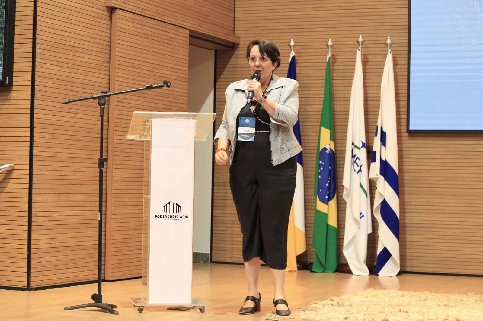Hodirley Canguçu Mulher ao microfone ministra palestra em seminário