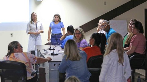 Elias Oliveira Homens e mulheres sentados durante treinamento ministrados por duas mulheres que estão em pé, uma de camisa branca e cabelos loiros soltos e outra de roupa azul e cabelos castanhos soltos, ambas atrás de uma mesa alta