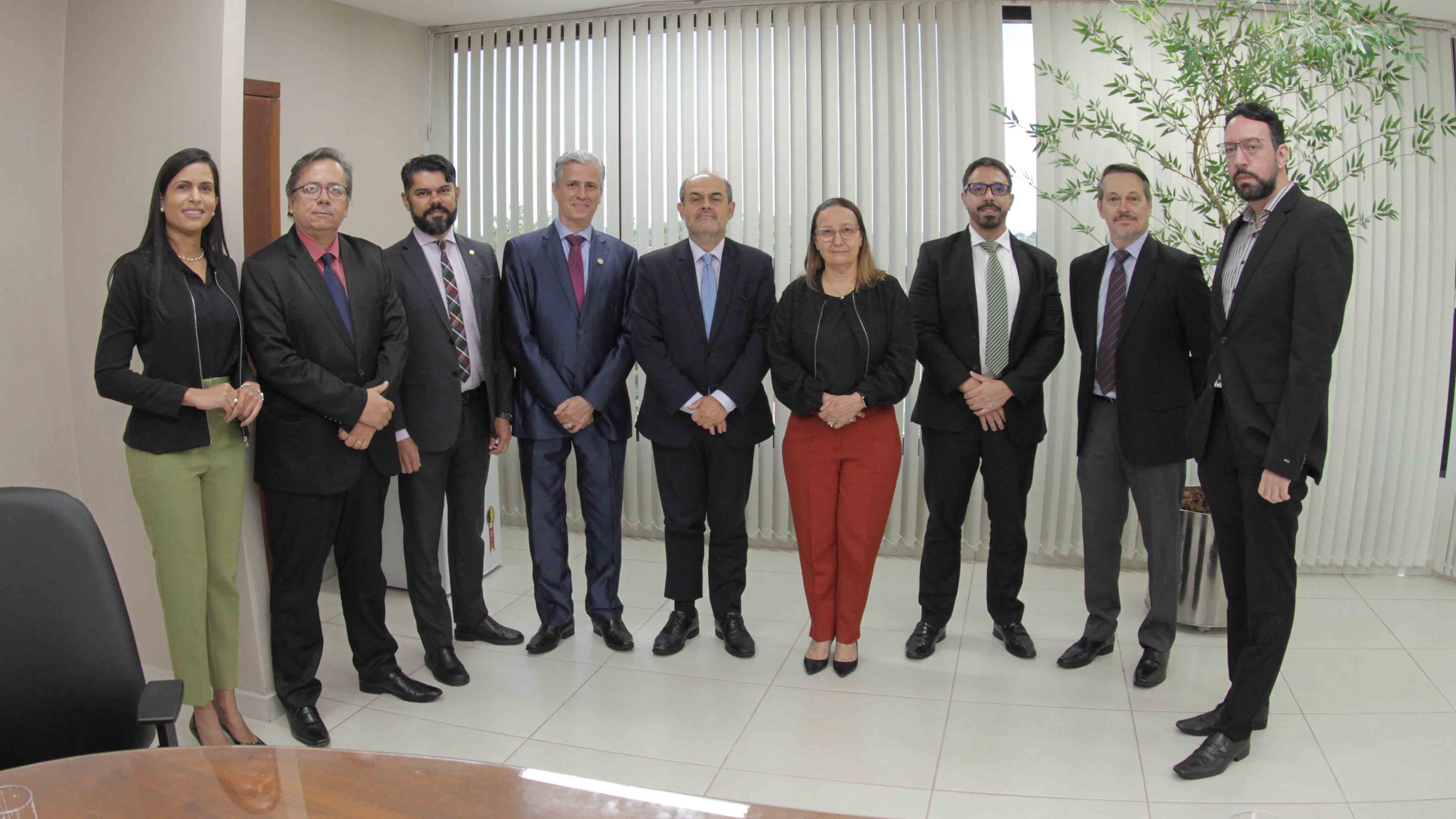 Lucas Nascimento Homens e mulheres vestidos de preto analisam documentos em mesa de reunião em sala branca com janela com persiana vertical aberta