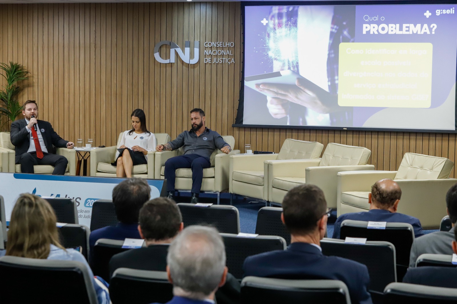 Agência CNJ de Notícias Harley Carreiro, desenvolvedor da Diretoria de Tecnologia da Informação do TJTO, aparece sentado à esquerda do palco durante painel no CNJ. Com microfone em mãos, ele apresenta a ferramenta Giseli enquanto, ao fundo, a projeção exibe a identidade visual da solução. Ao lado, outros participantes acompanham o debate, diante de uma plateia atenta à discussão sobre inteligência artificial no Judiciário.