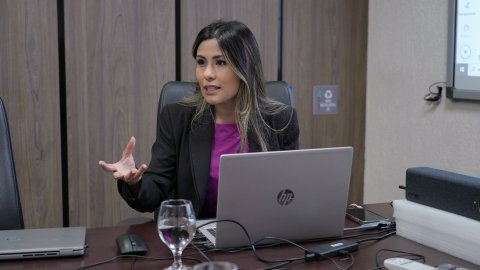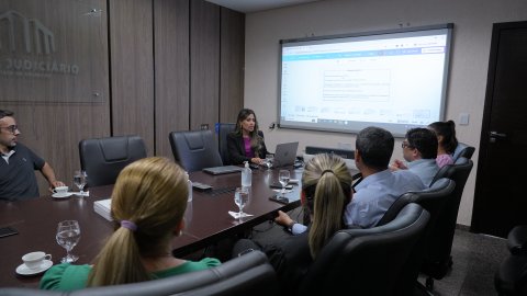 Lucas Nascimento Reunião em uma sala do Poder Judiciário, com cerca de dez participantes sentados ao redor de uma mesa oval, atentos à apresentação de uma mulher em pé à direita da imagem. Ela veste blazer preto e blusa roxa e gesticula enquanto fala. Sobre a mesa, notebooks, copos de água, frascos de álcool em gel e documentos. O ambiente é corporativo e formal, com painel de madeira e o brasão do Poder Judiciário ao fundo.