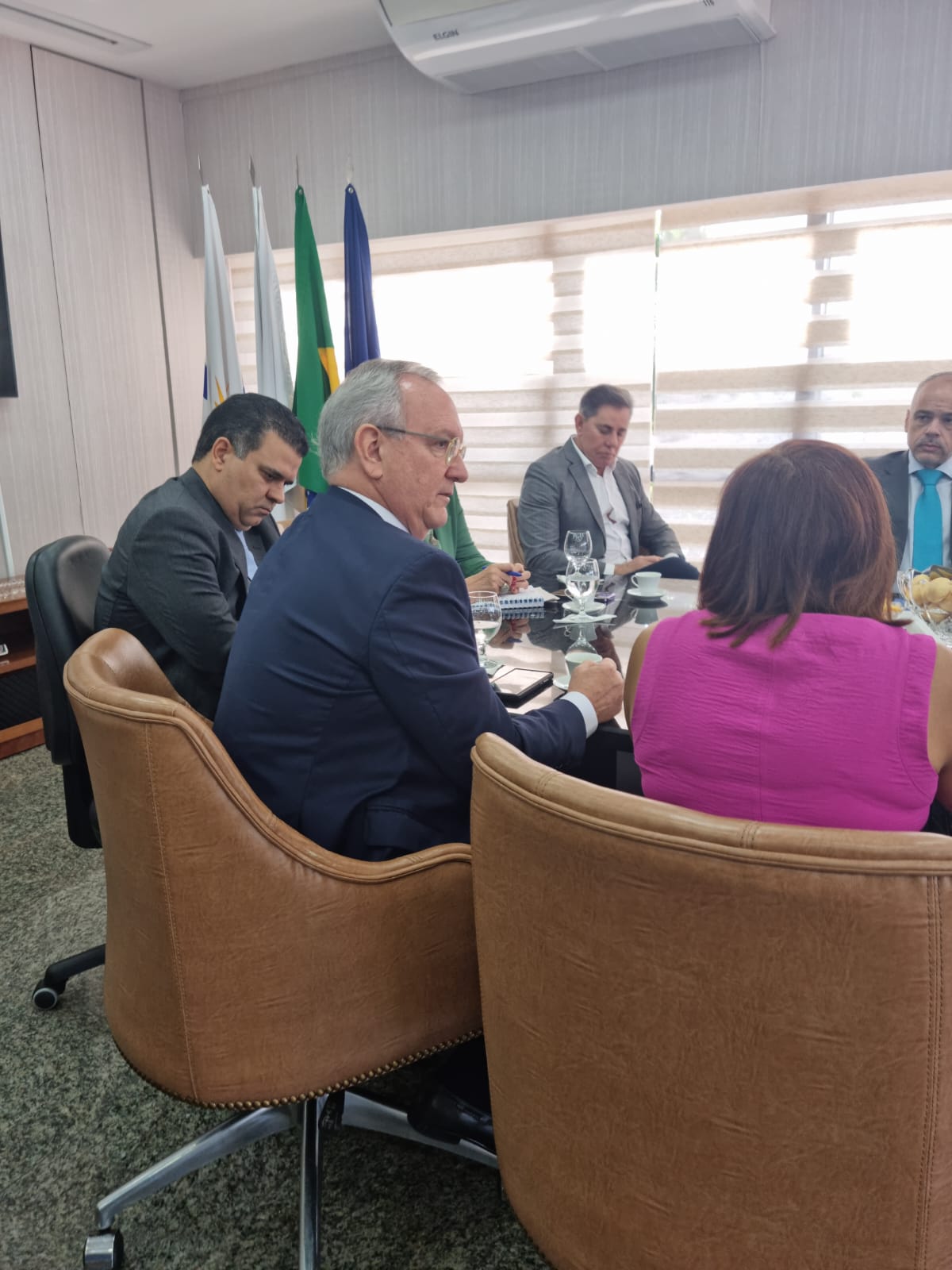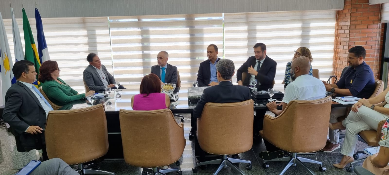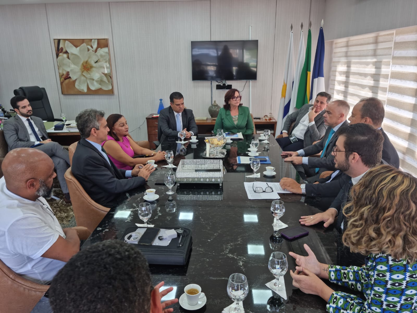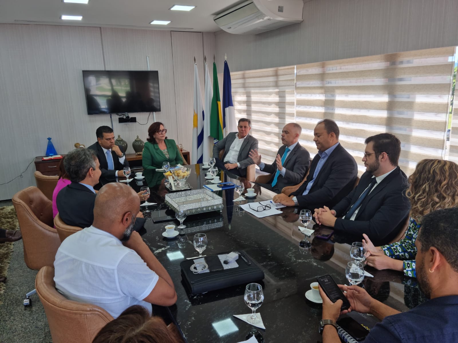 Cecom/TJTO Sala de reuniões com a presidente do TJTO, desembargadora Etelvina na ponta da mesa, de terno verde, ao lado de membros do CNJ, juízes do tocantins e representantes de instituições parceiras