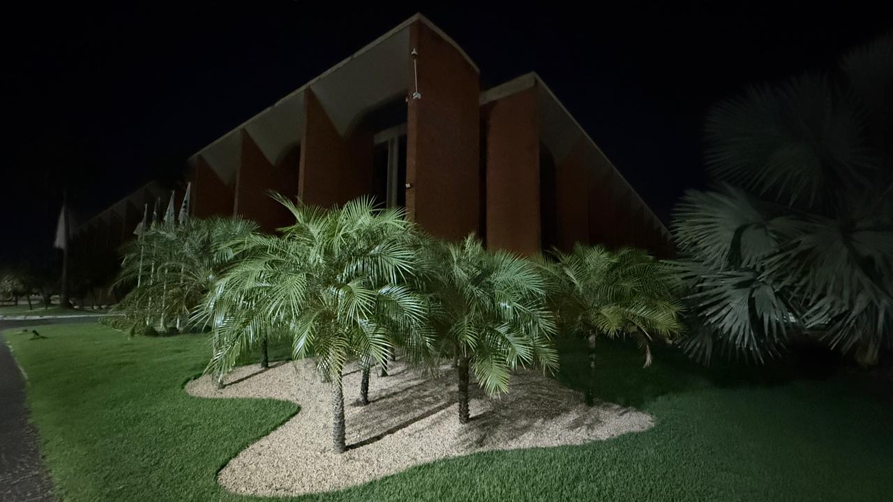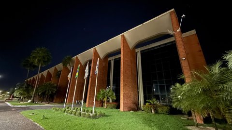 Rondinelli Ribeiro Fachada do TJTO com arcos em tijolinho expostos e vidros. O prédio está com luzes apagadas em adesão à campanha a Hora do Planeta