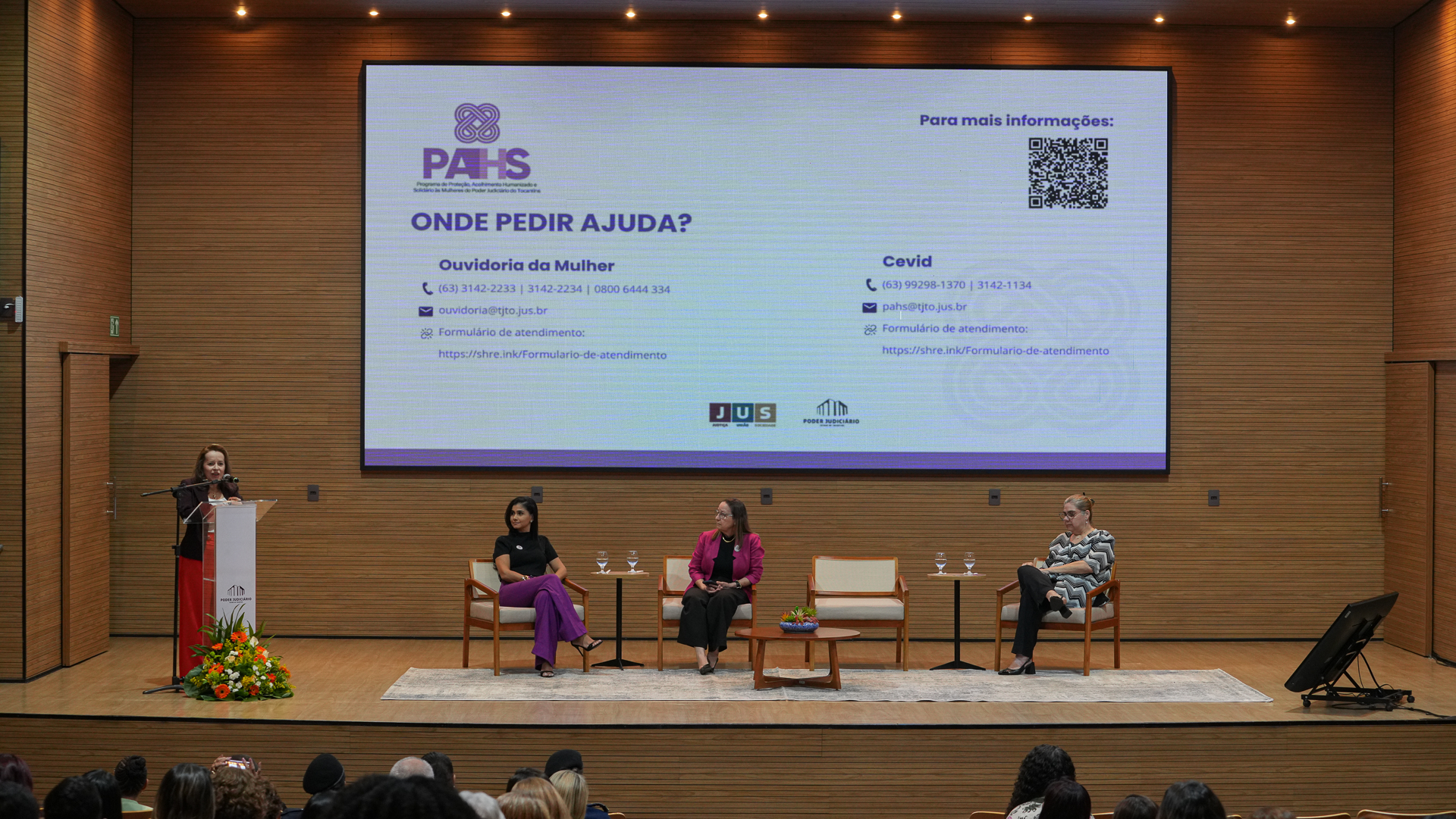 A programação seguiu com duas palestras voltadas à sensibilização e capacitação de magistrados(as) e servidores(as), abordando os temas: “O que não dizer: comunicação responsável com mulheres em situação de violência” e “Acolhimento humanizado de magistradas e servidoras em situação de violência doméstica e familiar do Poder Judiciário tocantinense”.