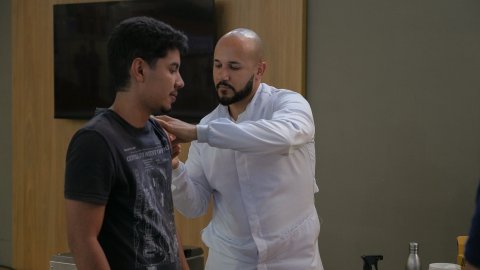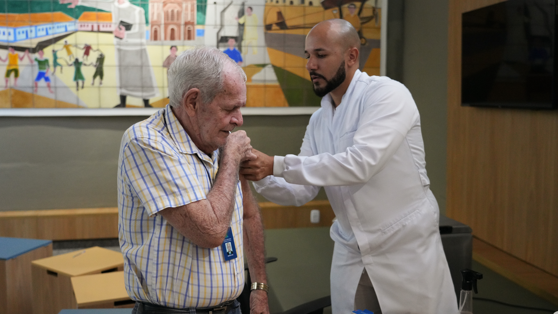 Servidor Fernando mostra cartão de vacina ao lado do enfermeiro