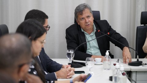 Elias Oliveira Homens e mulheres sentados em mesa branca em formato U, em sala de paredes brancas e persiana bege