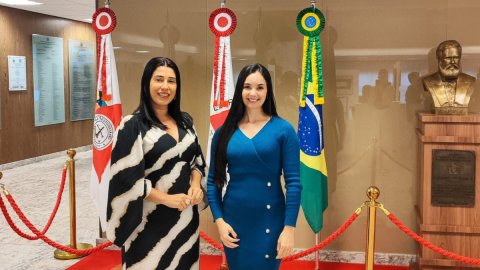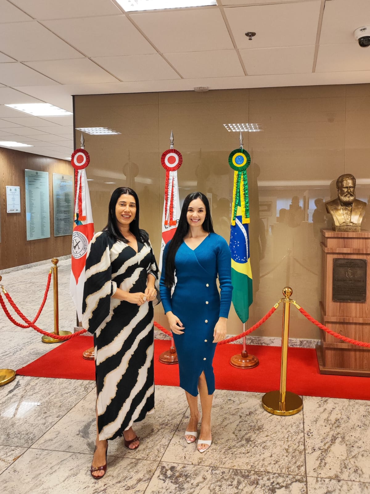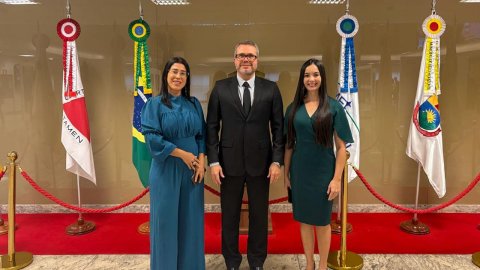 Divulgação O juiz Marcelo Laurito posa para foto ao lado das servidoras Dayse Santos Maciel e Sabrina Assakawa Ludgero Leal em espaço institucional. Ao fundo, aparecem bandeiras oficiais, incluindo a do Brasil, em ambiente interno com piso de mármore e cordões de isolamento.