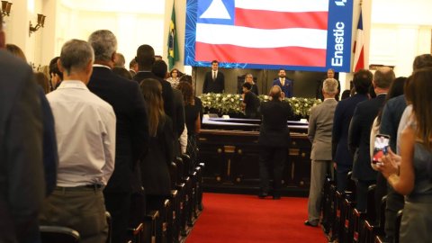TJBA A imagem mostra muitas pessoas sentadas em fileiras em um salão amplo. O espaço central é ocupado por mesas em forma de semicírculo e algumas pessoas em pé.
