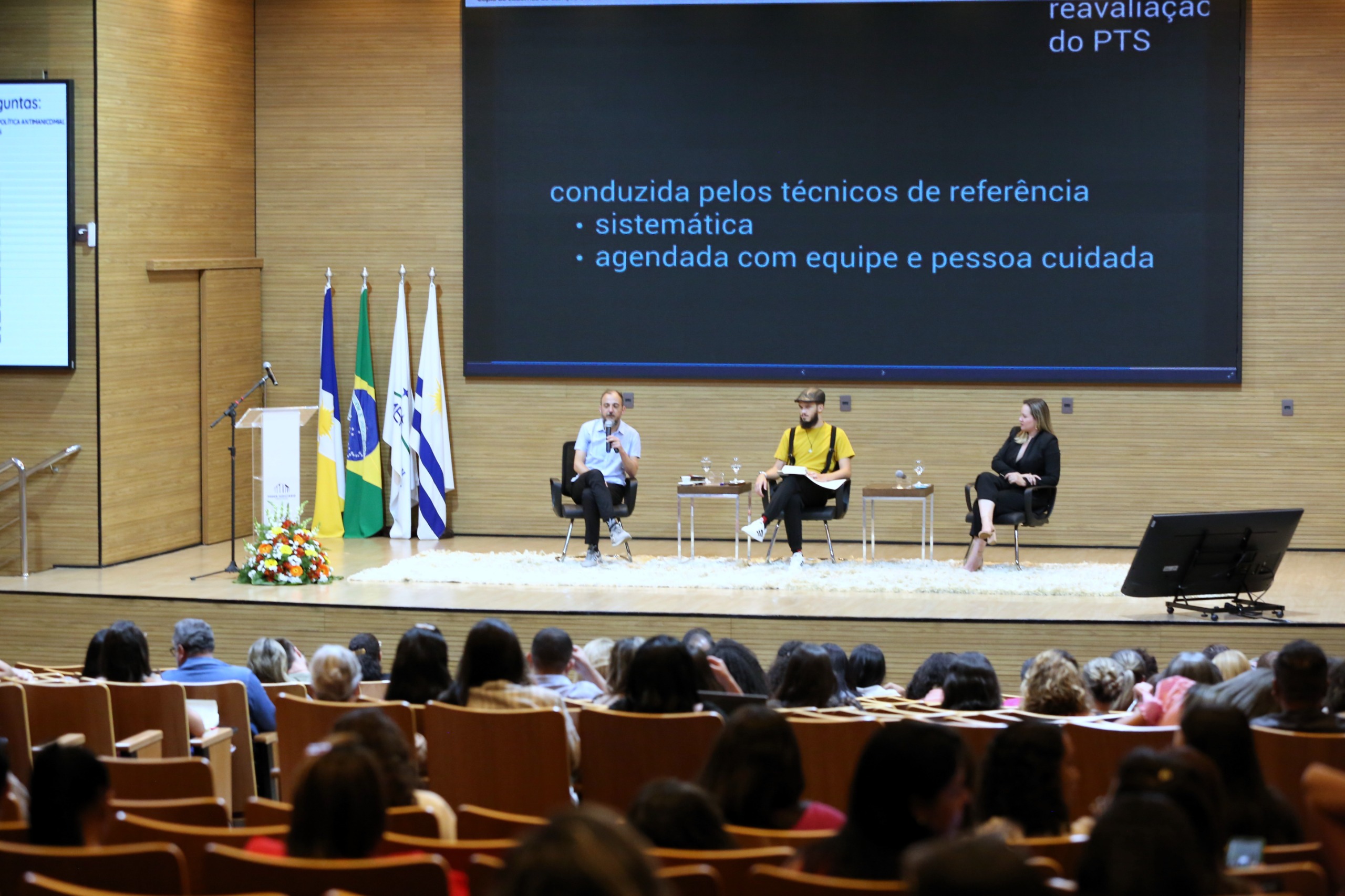Hodirley Canguçu/Esmat Imagem de um auditório com várias pessoas sentadas e no palco três pessoas sentadas; ao fundo um telão