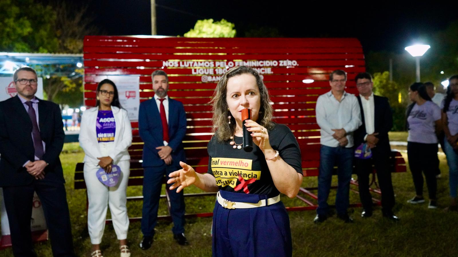 Coordenadora do Cevid, a juíza Cirlene Maria Assis agradeceu a presidência do TJTO por acreditar na inciativa do Banco Vermelho. Ela reforçou que o Banco fica na praça em um ponto de destaque, onde as pessoas possam sentar, fotografar, mas, mais do que isso, possam seguir o lema "sentar, refletir, levantar e agir”. Ela explicou ainda que o Banco tem a  cor vermelha porque representa o sangue derramado das mulheres que foram mortas  “pelo simples fato de serem mulheres”.  A magistrada ressaltou ainda que o tamanho do banco representa a importância da luta contra o feminicídio.