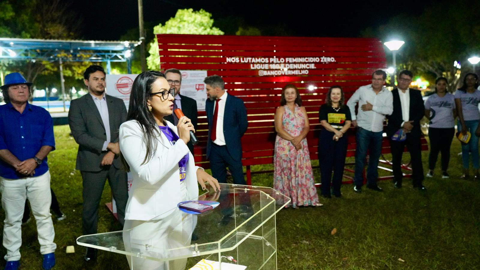 Representando o município, a secretária de Assistência Social, Ludmila Olímpio Maione Moreira, disse que a instalação do Banco Vermelho  é um momento muito importante para a cidade e também para todas as mulheres que lutam diariamente por um mundo mais justo e seguro. “O lançamento do projeto Banco Vermelho aqui em Colinas não é apenas a instalação de um símbolo físico em nossa praça, é um grito coletivo com justiça, igualdade e respeito. Este banco vermelho, como sangue derramado por tantas mulheres vítimas de violência, é um alerta permanente sobre a urgência de ações e políticas públicas que promovam a segurança e a dignidade de todas as mulheres”.