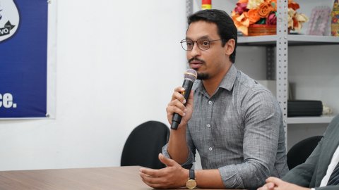 Fotos: Elias Oliveira Pessoas sentadas em cadeiras organizadas em auditório acompanham reunião institucional. À frente, uma mesa com autoridades e convidados sentados, sendo um dos participantes em pé falando ao microfone. O ambiente é interno, com banners institucionais ao fundo e instrumentos musicais apoiados na parede lateral.