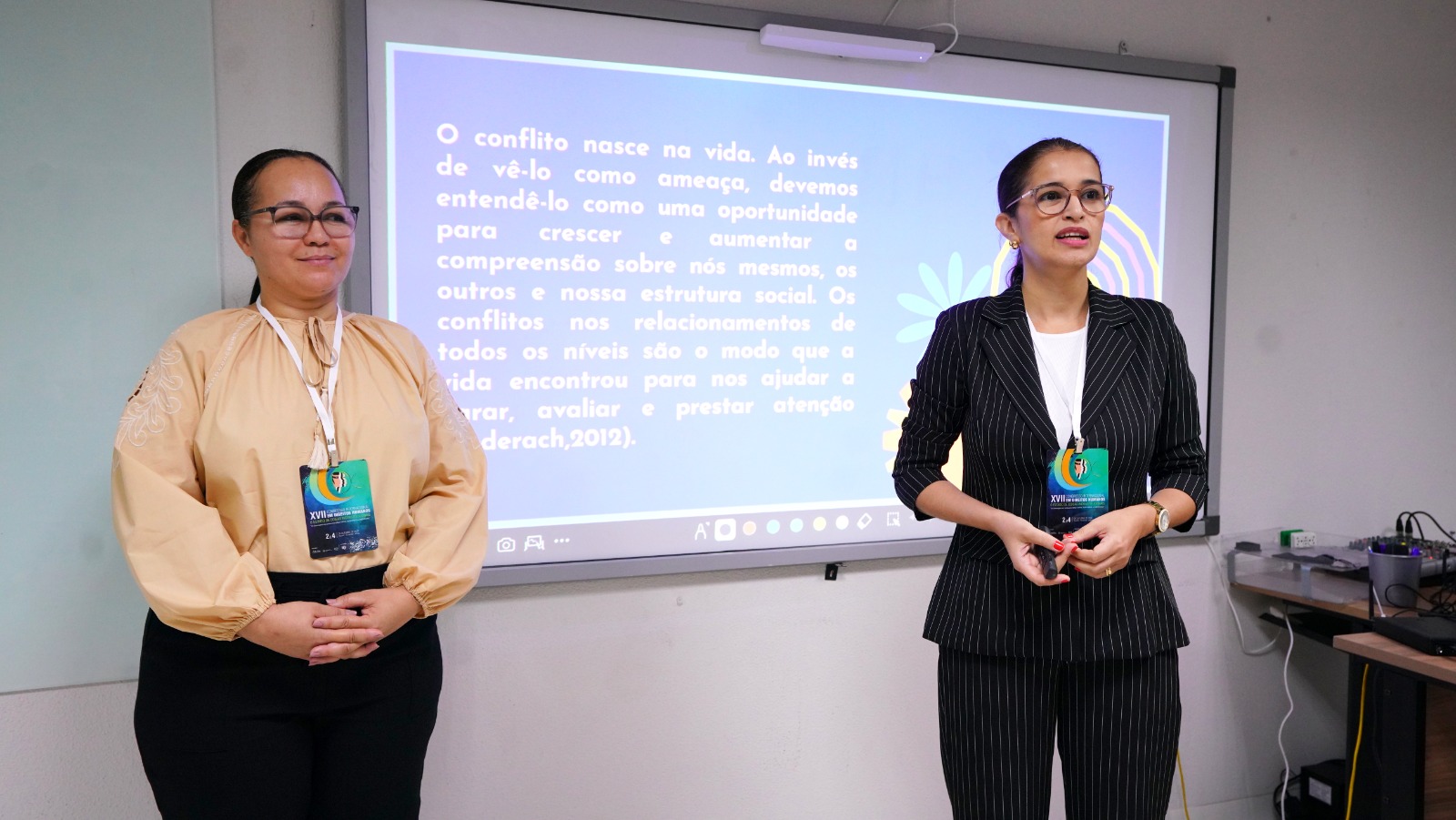 Além disso, a egressa do PPGPJDH Marcela Santa Cruz Melo e a discente Taynã Nunes Quixabeira mostraram como a comunicação pode ser uma ferramenta poderosa para a paz e à resolução de conflitos, no minicurso “Círculo de Construção de Paz como instrumento de comunicação interpessoal e prevenção de conflitos”.