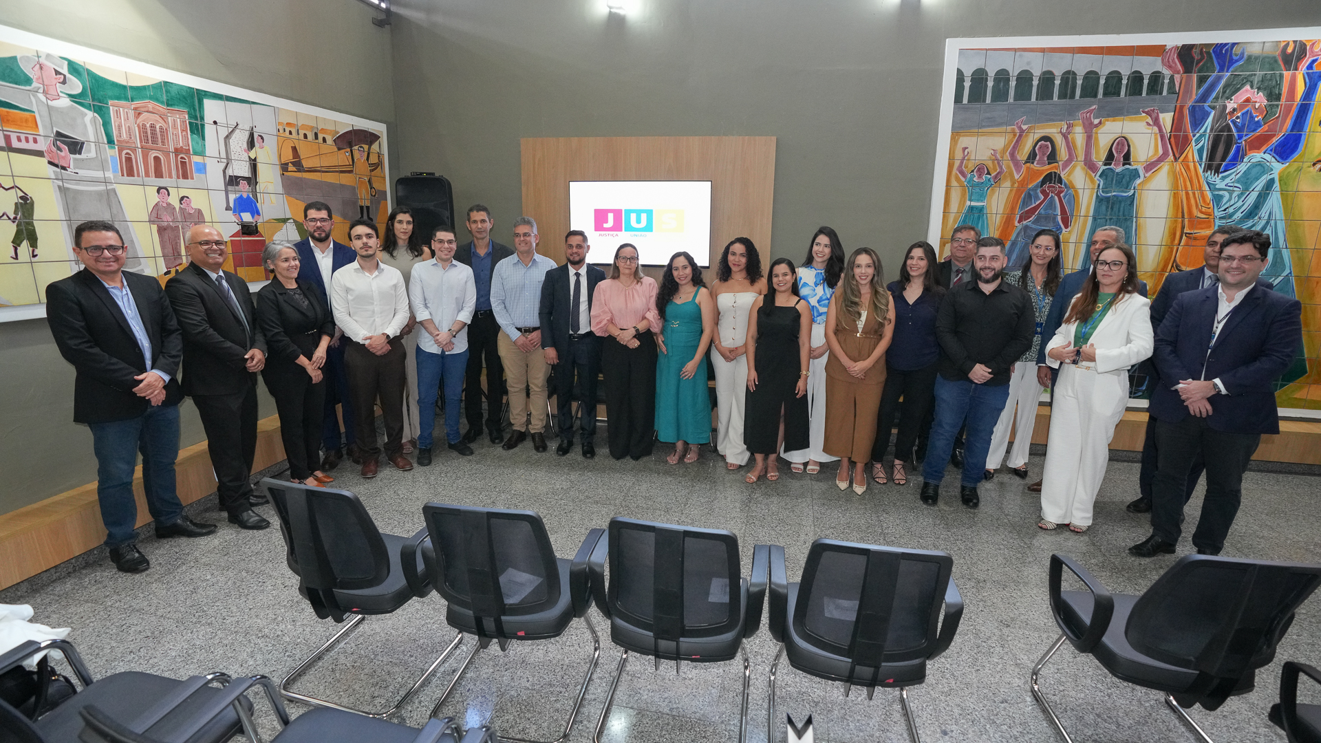 Grupo de magistrados e servidores posando para foto em um auditório.