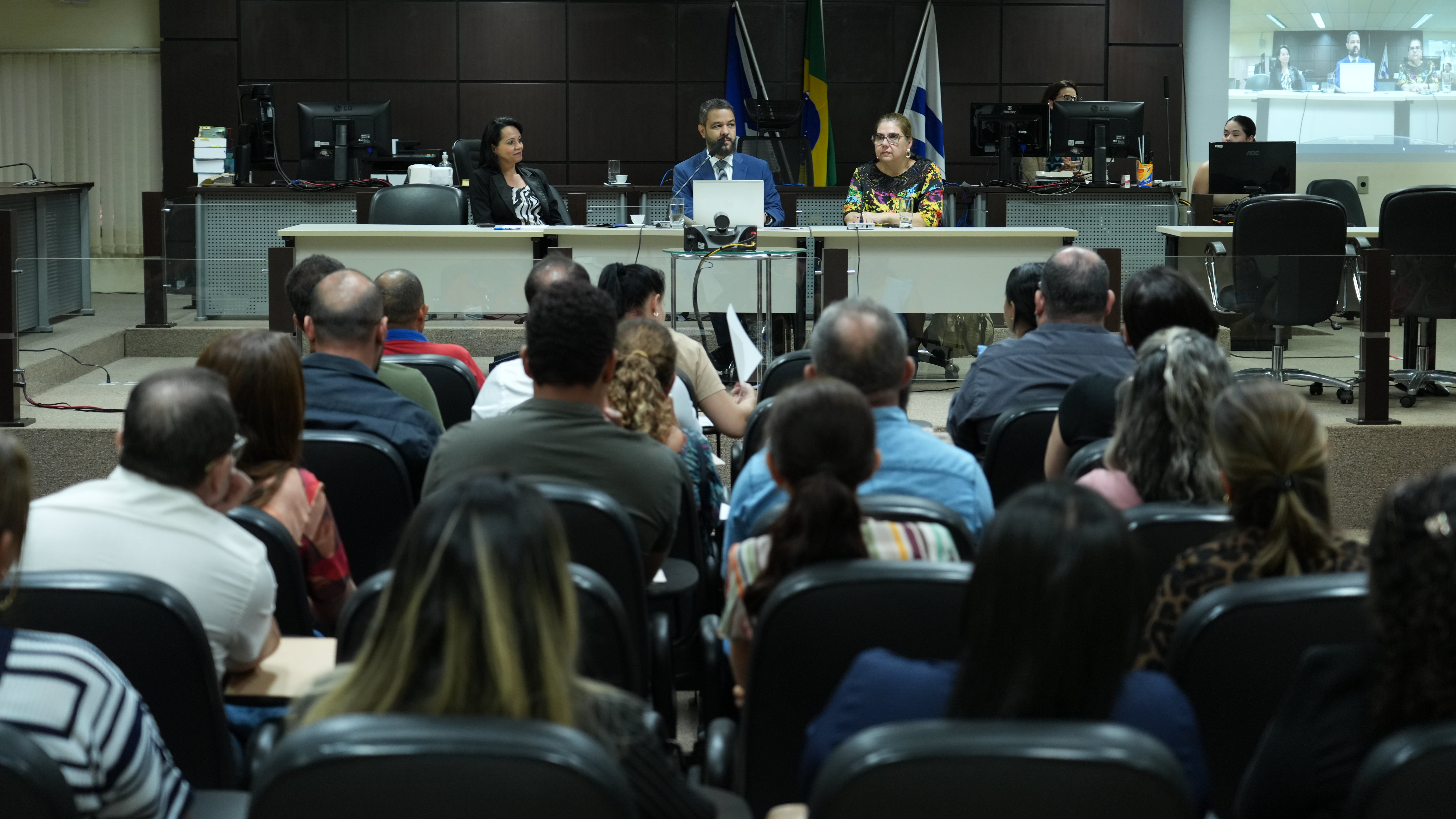 Imagem de uma mesa com a presença de três pessoas sentadas, ao centro o juíz, de terno, fala ao microfone; ao fundo uma placa com o nome Centro Cultural Lêda Bernadon