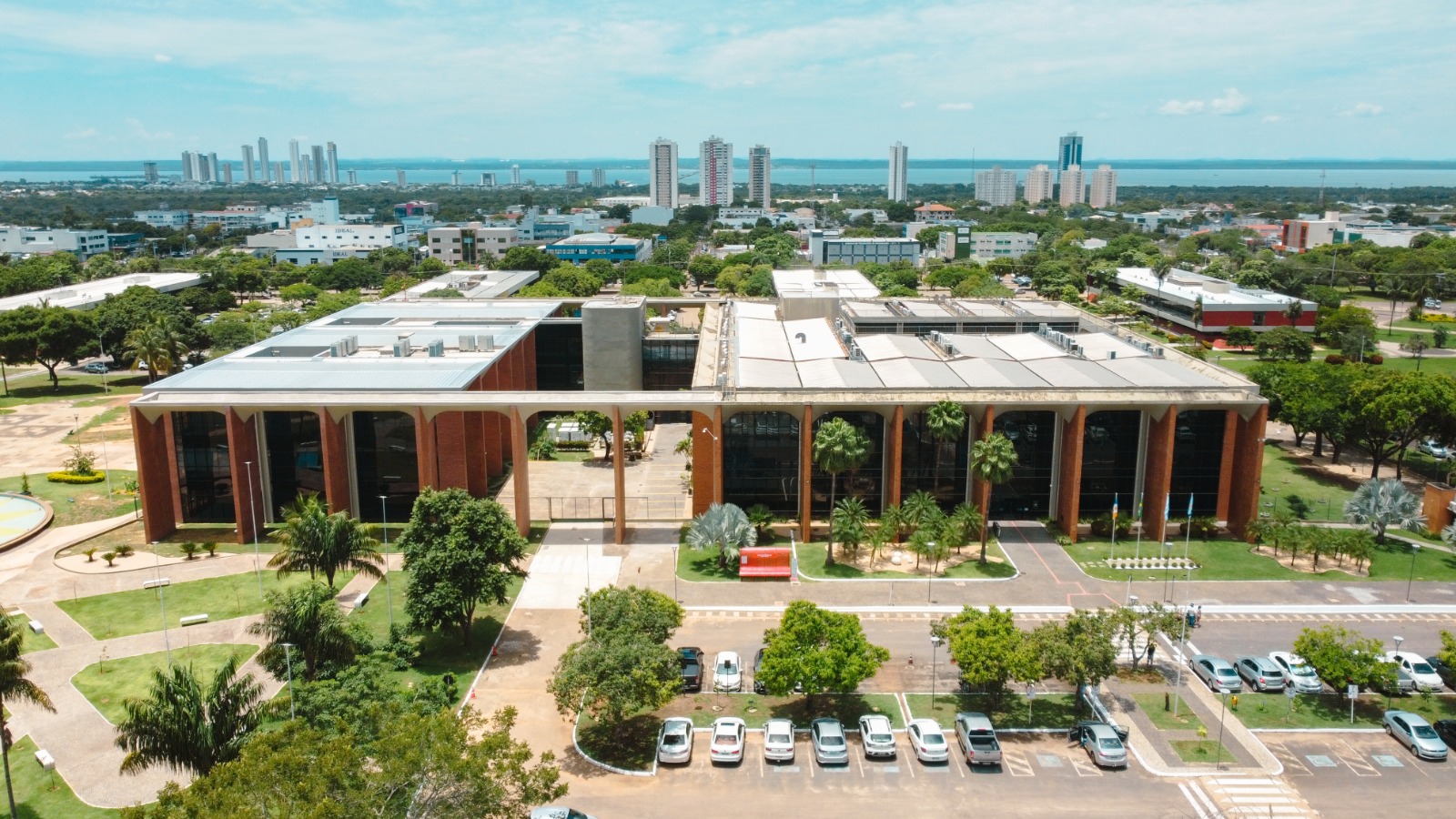 Fachada do prédio do Tribunal de Justiça do Tocantins com suas colunas e vidraças; à frente um jardim com várias palmeiras.